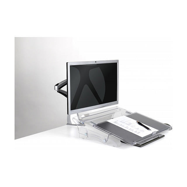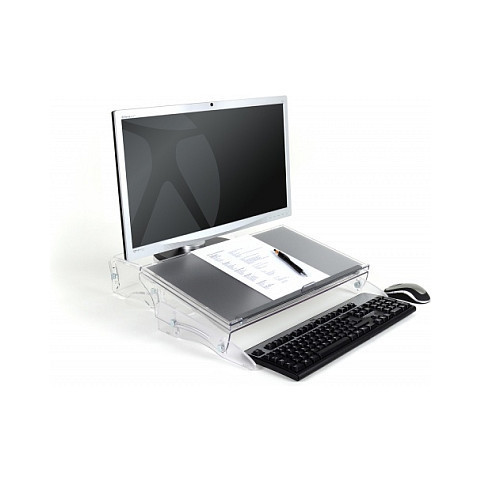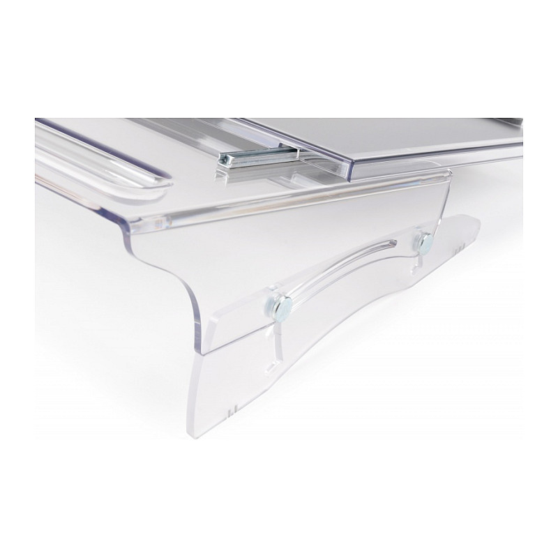Easily pull the anti-reflecting satin surface towards you and take notes on it. The smooth-running rails allow the platform to slide forward. The high-quality acrylic material makes the FlexDesk 640 stable, and the transparent design ensures that your desk does not look overloaded. The FlexDesk 640 provides great features like three levels of height adjustment between 110 and 180 mm, anti-slip-feet, foam edge for the outer edge of the hand, high sliding edge for heavy file folders, a load capacity up to five kg, and a hidden pen-tray. Start working in a line with the FlexDesk 640 document holder and increase your working comfort and productivity."