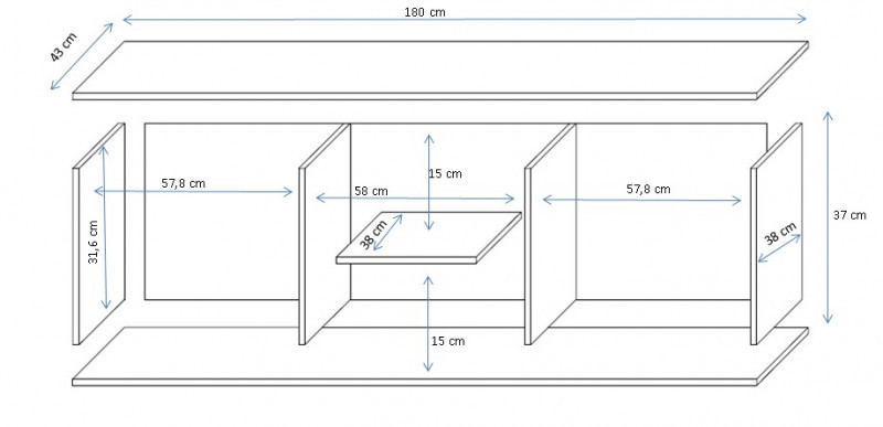 TV spintelė SOHO: 37/180/43 du atvartai, atsiveriantys žemyn, blizgus priekis, dvi lentynos elektroninei įrangai |