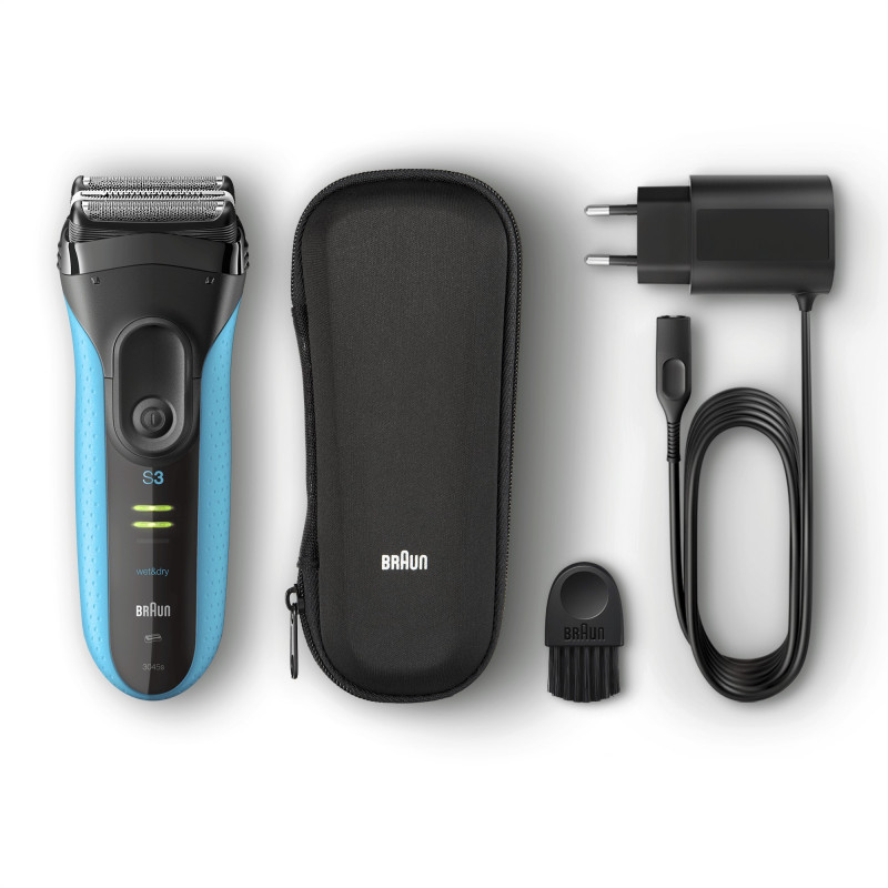 "Braun Series 3 ProSkin 3045s. Shaver system: Foil shaver, Product colour: Black, Blue, Shaving system technologies: 2 SensoFoil, 1 Middle Trimmer. Power source: Battery, Battery technology: Nickel-Metal Hydride (NiMH), Operating time: 45 min. Weight: 432 g, Battery weight: 22 g. Package width: 67.5 mm, Package depth: 155 mm, Package height: 222 mm. Quantity per pack: 1 pc(s)"\n"MicroComb Technology