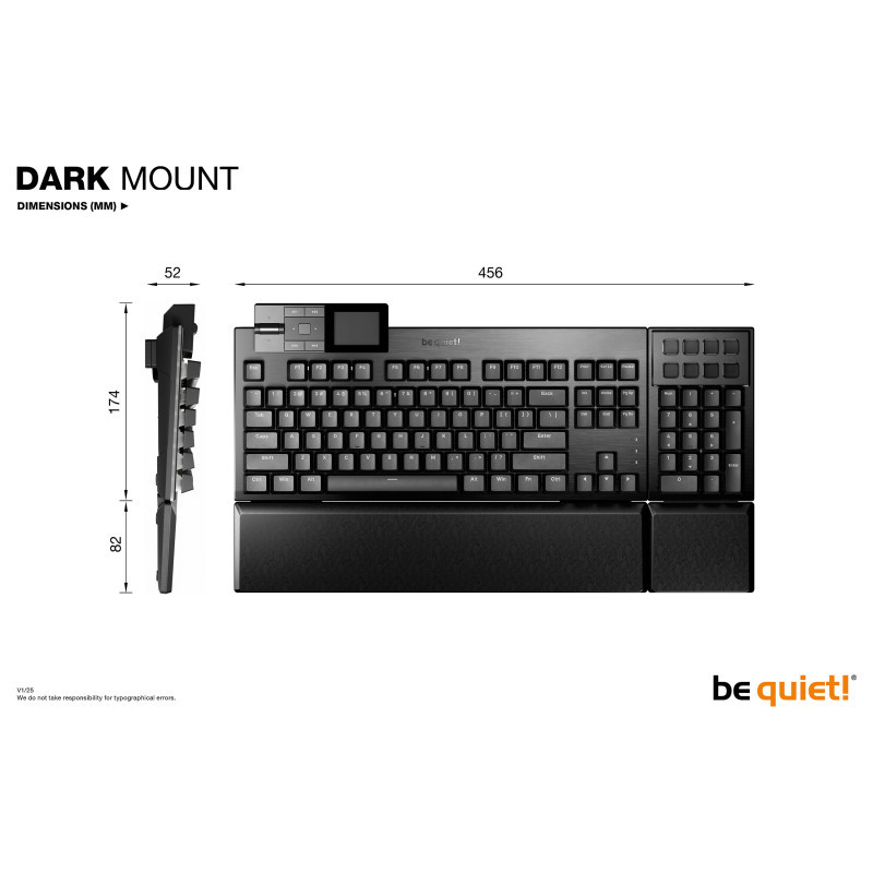 "be quiet! Dark Mount Silent Linear FR ISO. Keyboard form factor: Full-size (100%). Keyboard style: Straight. Connectivity technology: Wired, Device interface: USB, Keyboard key switch: Mechanical, Keyboard layout: AZERTY. Backlight type: RGB LED, Wrist rest. Recommended usage: Gaming. Product colour: Black"\n"Keys to excellence