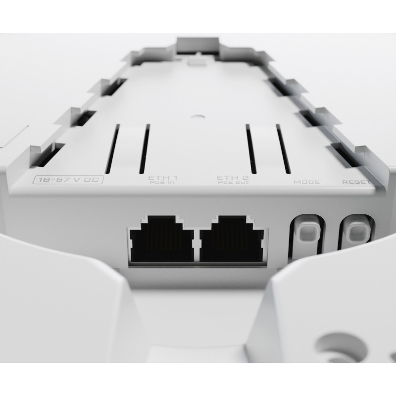 Even though the radio supports repeater mode, the two Gigabit Ethernet ports give you the ability to extend your network with cables, even if PoE power is required: the cAP XL ac supports 802.3af/at PoE input on the first port and passive PoE output (up to 57V) on the second port."