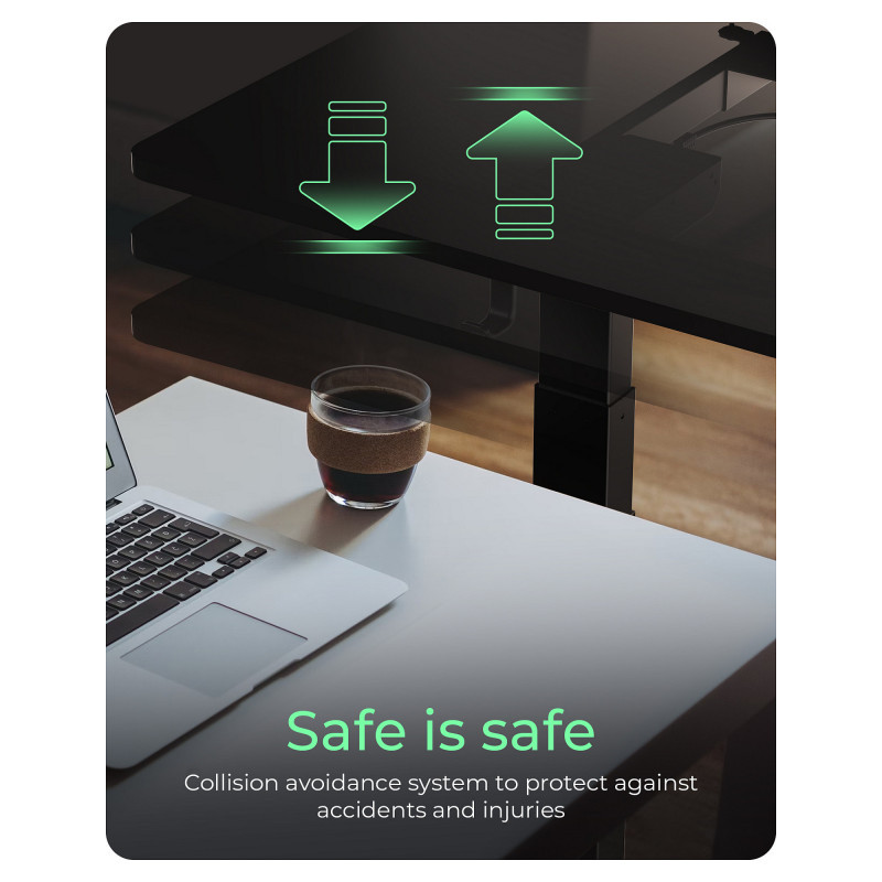 Two quiet motors reliably move the stable, smooth-running and infinitely adjustable table base. The trouble-free height adjustment with a speed of 30 mm/s enables a transition from sitting to standing and vice versa in a matter of seconds. It is operated with just the touch of a finger."