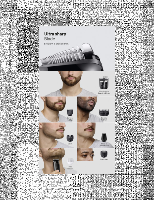 Sliding Beard Comb 3-11 mm, Sliding Hair Comb 13-21 mm, Sensitive comb (Skin), Fixed combs with 1 mm & 2 mm, Eyebrow Comb, Detail Comb |