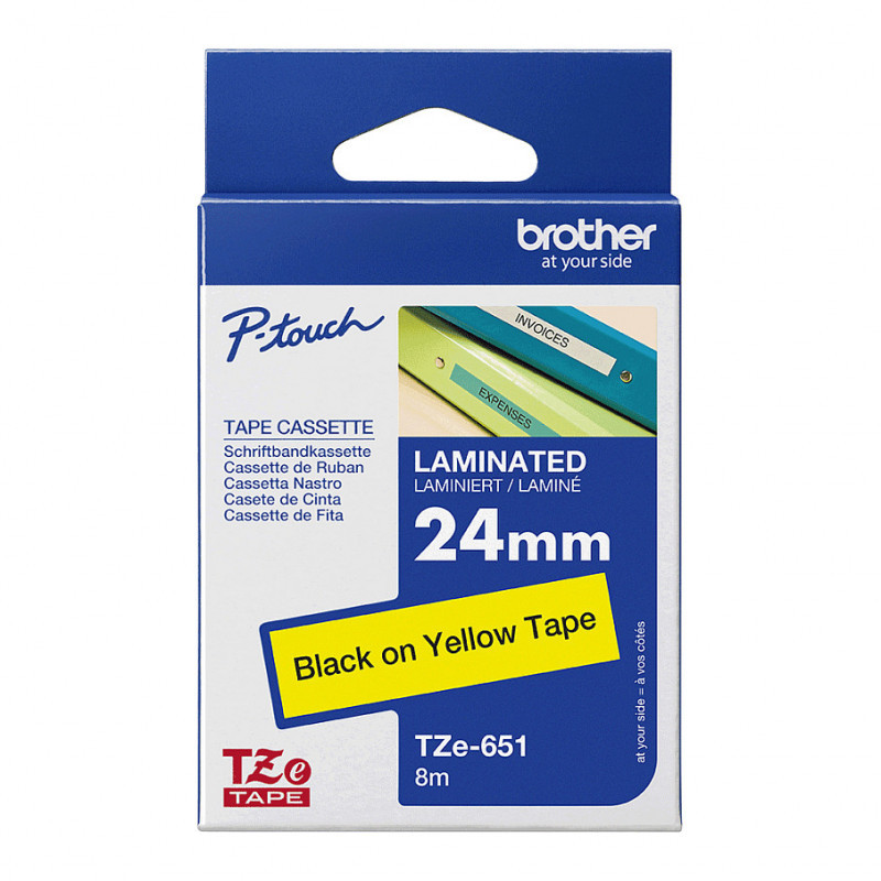 "Brother Labelling Tape 24mm. Product colour: Yellow, Country of origin: Philippines, Spare part retention: 5 year(s). Tape width: 2.4 cm, Tape length: 8 m, Width: 24 mm. Pallet gross height: 13.8 cm, Master (outer) cases per pallet: 25 pc(s), Layers per pallet: 5 pc(s)"\n"Compatible with a wide range of Brother’s P-touch printers, this genuine laminated TZe-651 labelling tape cassette is especially versatile thanks to its easy-to-read black and Yellow colour – so it comes in useful around the home, office and in other workplaces."