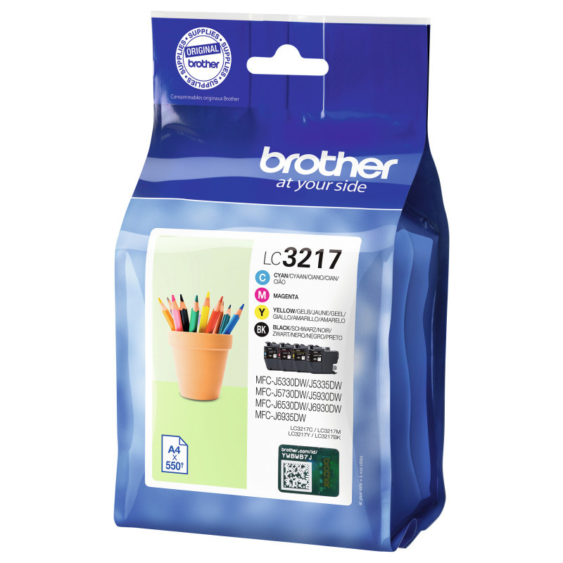 "Brother LC3217VAL. Supply type: Multi pack, Colour ink page yield: 550 pages, Printing colours: Black, Cyan, Magenta, Yellow, Quantity per pack: 4 pc(s), Black ink page yield: 550 pages"\n"Looking for a cartridge that offers effortless performance every time you print? The Brother LC3217VAL value pack (including black, cyan, yellow and magenta ink cartridges) guarantees smooth, reliable and top quality printouts from your first to your last print. Great value for money, our perfectly balanced inks ensure your printer stays working at its best."