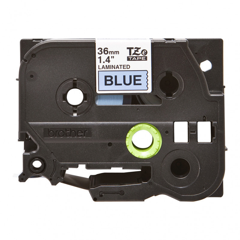 "Brother Laminated tape 36mm. Label colour: Black on blue, Tape type: TZe, Product colour: Grey. Tape width: 3.6 cm, Tape length: 8 m, Width: 40 mm. Pallet gross height: 13.7 cm, Master (outer) cases per pallet: 36 pc(s), Layers per pallet: 9 pc(s)"\n"Compatible with a wide range of Brother’s P-touch printers, this genuine laminated TZe-561 labelling tape cassette is especially versatile thanks to its easy-to-read black and Blue colour – so it comes in useful around the home, office and in other workplaces."