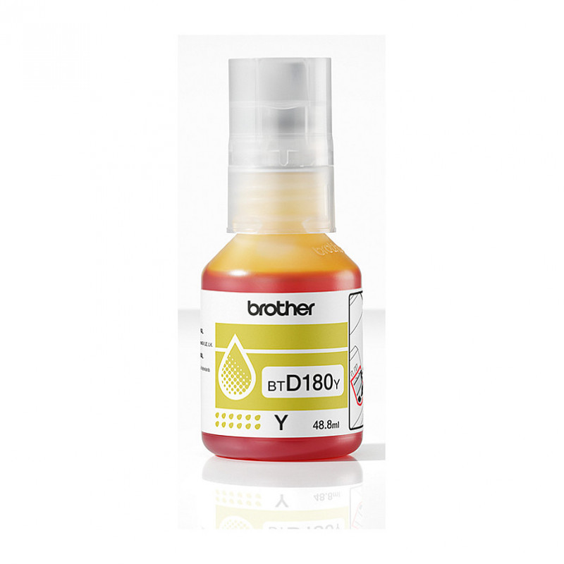 "Brother BTD180Y Yellow Genuine Ink Bottle. Type: Original, Printing colours: Yellow, Brand compatibility: Brother. Quantity per pack: 1 pc(s), Dimensions (WxDxH): 40 x 100 x 45 mm, Package width: 56 mm"\n"Designed to ensure quality documents every time you print, the genuine Brother BTD180Y yellow ink bottle provides a super high yield of 5000 pages, so you can put an end to regular ink replenishment. Just fill up the ink tank and enjoy long-lasting professional quality prints."