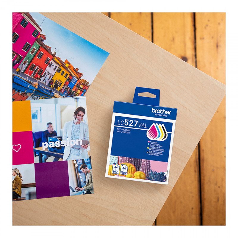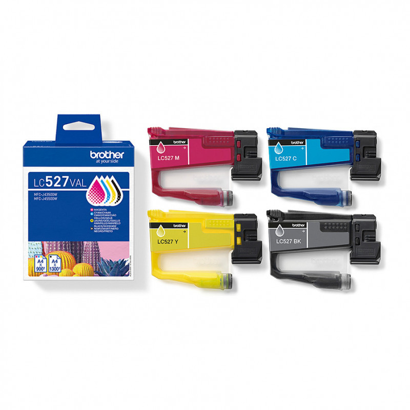 "Brother Genuine LC527VAL Ink Cartridge Value Pack. Colour ink type: Pigment-based ink, Black ink type: Pigment-based ink, Supply type: Value pack, Colour ink page yield: 900 pages, Printing colours: Black, Cyan, Magenta, Yellow, Quantity per pack: 4 pc(s), Black ink page yield: 1300 pages"\n"High quality supplies are essential for achieving outstanding print results. The Brother LC527VAL multipack (including black, cyan, yellow and magenta pigment ink cartridges), is formulated to produce vibrant colours and sharp text. Whether you are printing images, presentations, or documents, they enhance overall print quality.