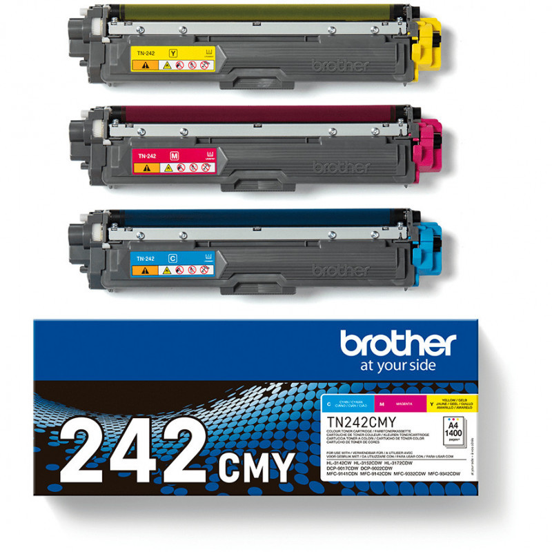"Brother TN-242CMY. Colour toner page yield: 1400 pages, Printing colours: Cyan, Magenta, Yellow, Quantity per pack: 1 pc(s)"\n"Das Original Brother TN-242CMY Value Pack enthält die Farben Cyan, Magenta und Gelb und ist perfekt auf die Brother Drucker abgestimmt, dass beste Ergebnisse in brillanten Farben erzielt werden. Die Kartuschen sind leicht zu installieren. Profitieren Sie von langlebigen und hochwertigen Ausdrucken.