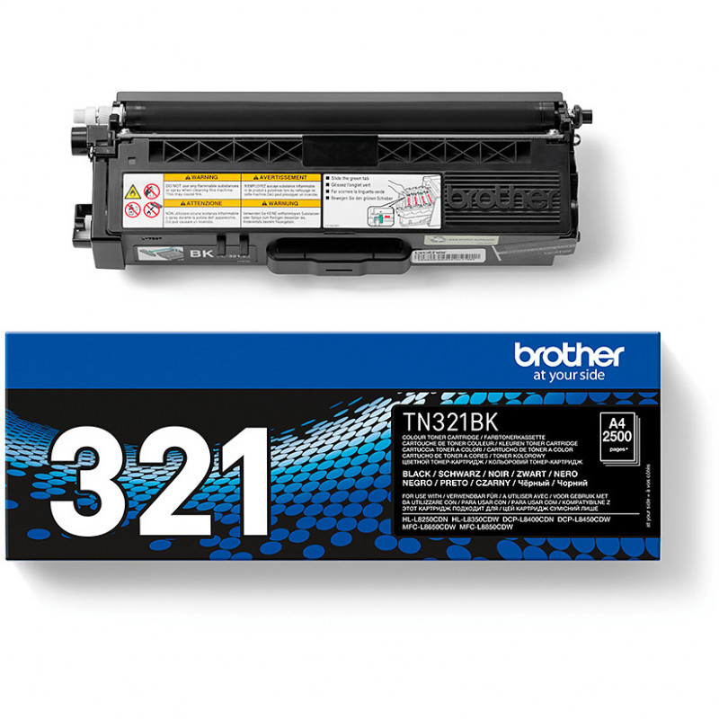 "Brother TN-321BK. Black toner page yield: 2500 pages, Printing colours: Black, Quantity per pack: 1 pc(s)"\n"Choose this genuine Brother TN-321BK Toner Cartridge in Black to ensure you get the high quality, professional results that your important documents deserve, day after day. Easy to install, it provides a cost-effective printing solution for your office."