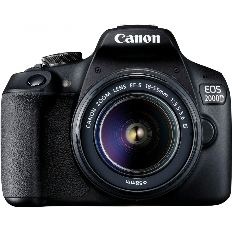 "Canon EOS 2000D + EF-S 18-55mm f/3.5-5.6 III. Camera type: SLR Camera Kit, Megapixel (approx.): 24.1 MP, Sensor type: CMOS, Maximum image resolution: 6000 x 4000 pixels. ISO sensitivity (max): 6400. Focal length range: 18 - 55 mm. Fastest camera shutter speed: 1/4000 s. Wi-Fi. HD type: Full HD, Maximum video resolution: 1920 x 1080 pixels. Display diagonal: 7.62 cm (3""). Viewfinder type: Optical. PictBridge. Product colour: Black"\n