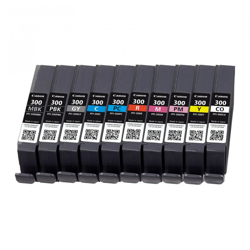 "Canon PFI-300. Supply type: Multi pack, Printing colours: Black, Blue, Cyan, Grey, Magenta, Photo black, Photo magenta, Red, Yellow, Quantity per pack: 10 pc(s)"\n"This convenient and cost-effective ten ink multipack contains all the colours you need for your printing needs. This multipack consists of the following colour ink cartridges: matte black, photo black, photo magenta, photo cyan, chroma optimiser, red, grey, yellow, cyan and magenta. Bring your images to life with these ten pigment-based 14.4 ml ink cartridges that promise deep and rich colour. Meanwhile the Chroma Optimiser makes black colours deeper, expands colour gamut and helps deliver even glossiness."