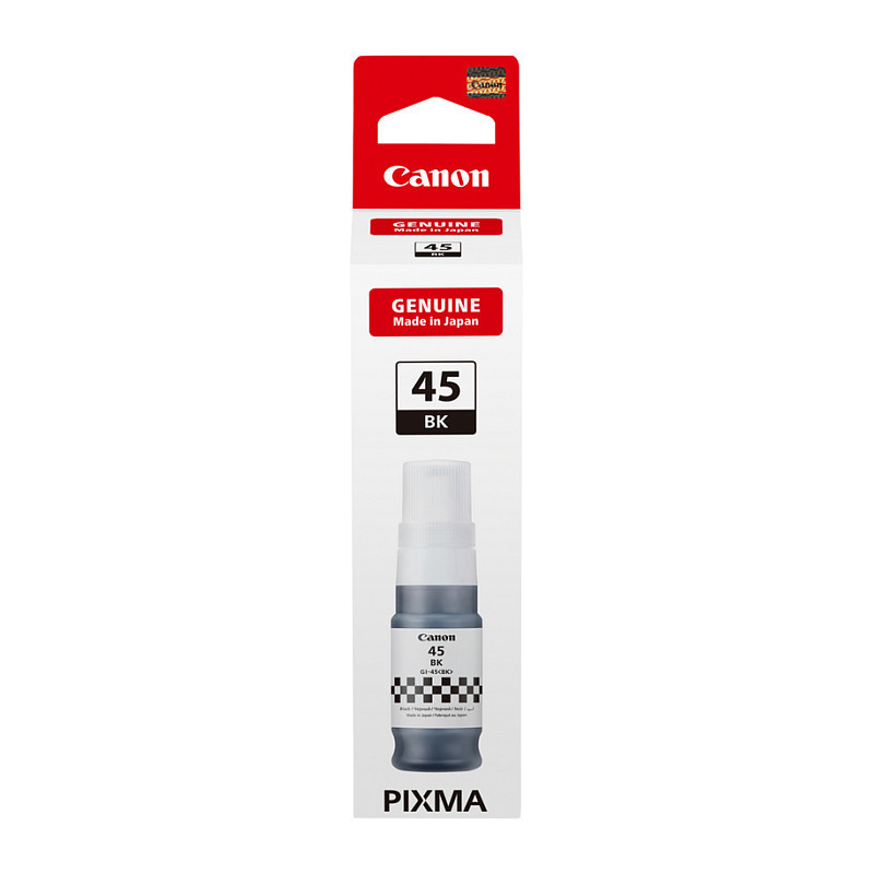 "Canon GI-45BK. Black ink volume: 70 ml, Supply type: Single pack, Printing colours: Black, Quantity per pack: 1 pc(s), Black ink page yield: 3000 pages"\n
