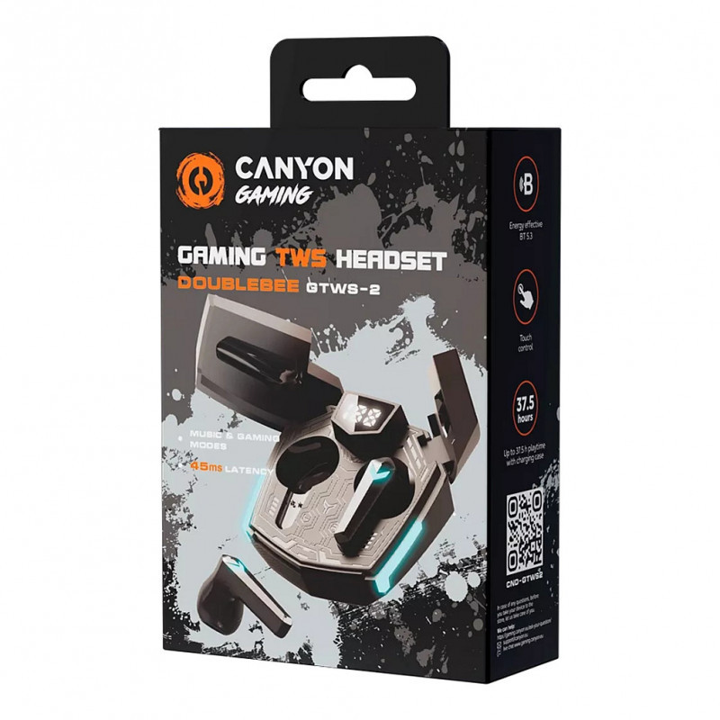 "Canyon GTWS-2. Product type: Headset. Connectivity technology: Wireless, Bluetooth. Recommended usage: Gaming. Headphone frequency: 20 - 20000 Hz. Cable length: 0.3 m. Weight: 46 g. Product colour: Black"\n"Are you a serious gamer looking for the ultimate audio experience? Look no further than this gaming headset from Canyon — ''DoubleBee'' GTWS-2. These true wireless earphones are designed specifically for gaming, providing an immersive audio experience. With a low latency of just 45ms in gaming mode, you'll never miss a beat or experience any lag. There’s also a dedicated Music mode, which ensures the best possible audio quality. The earphones use Bluetooth 5.3 for a stable and energy-efficient connection to your gaming device, allowing you to move around without worrying about losing your connection. With an impressive battery life of up to 4 hours on a single charge and up to 37.5 hours with the charging case, you'll never have to worry about running out of juice mid-game. Besides, the earbuds have a quick charge mode: from zero to full battery in just 60 minutes. It’s worth noting that the charging case has a unique design that resembles the iconic Bumblebee. Available in black, orange, and yellow, this case definitely looks fresh in the world of gray and white earbuds. Get a next-level experience with ''DoubleBee'' – the new true wireless headset from Canyon Gaming!