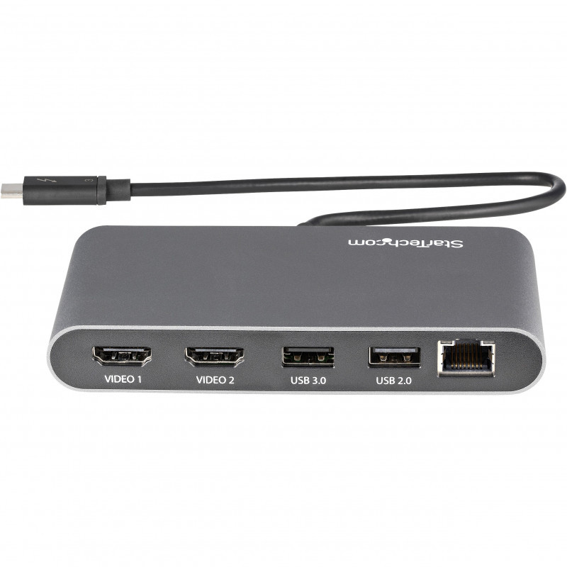 "StarTech.com Thunderbolt 3 Mini Dock - Portable Dual Monitor Docking Station w/HDMI 4K 60Hz, 2x USB-A Hub (3.0/2.0), GbE - 11in/28cm Cable - TB3 Multiport Adapter - Mac/Windows. Connectivity technology: Wired, Host interface: Thunderbolt 3. Ethernet LAN data rates: 10,100,1000 Mbit/s, Networking standards: IEEE 802.3ab, IEEE 802.3i, IEEE 802.3u. Product colour: Grey, Maximum digital resolution: 3840 x 2160 pixels. Windows operating systems supported: Windows 10, Windows 10 Education, Windows 10 Education x64, Windows 10 Enterprise, Windows 10..., Mac operating systems supported: Mac OS X 10.10 Yosemite, Mac OS X 10.11 El Capitan, Mac OS X 10.12 Sierra, Mac OS X 10.13 High..., Server operating systems supported: Windows Server 2008 R2, Windows Server 2012, Windows Server 2012 x64. Width: 69 mm, Depth: 124 mm, Height: 27 mm"\n"Laptop Docking Station | Mac & Windows® | Bus-Powered | 2x USB-A