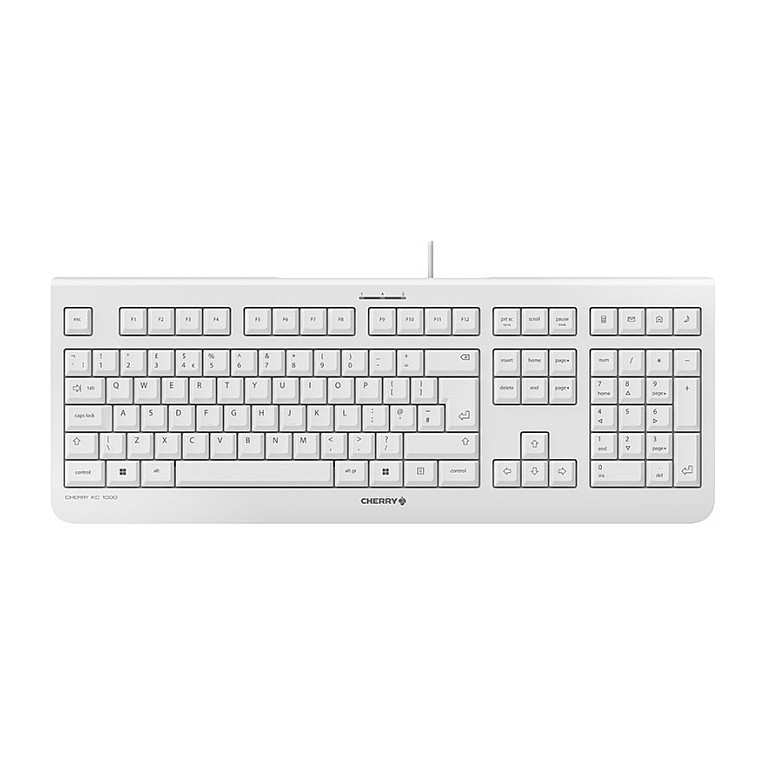 "CHERRY KC 1000 Corded Keyboard,Pale Grey, USB (QWERTY - UK). Keyboard form factor: Full-size (100%). Keyboard style: Straight. Connectivity technology: Wired, Device interface: USB, Keyboard key switch: Mechanical, Keyboard layout: QWERTY, Keyboard number of keys: 109. Cable length: 1.8 m. Recommended usage: Universal. Product colour: Grey"\n"CHERRY KC 1000 is rock-solid CHERRY technology with an excellent price/performance ratio. Modern, flat design with gentle, quiet and durable abrasion-resistant keys. Universal, reliable and optimized for professional use."
