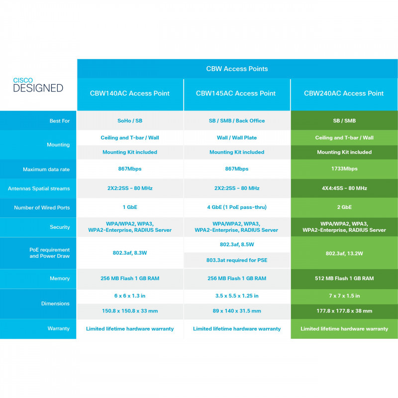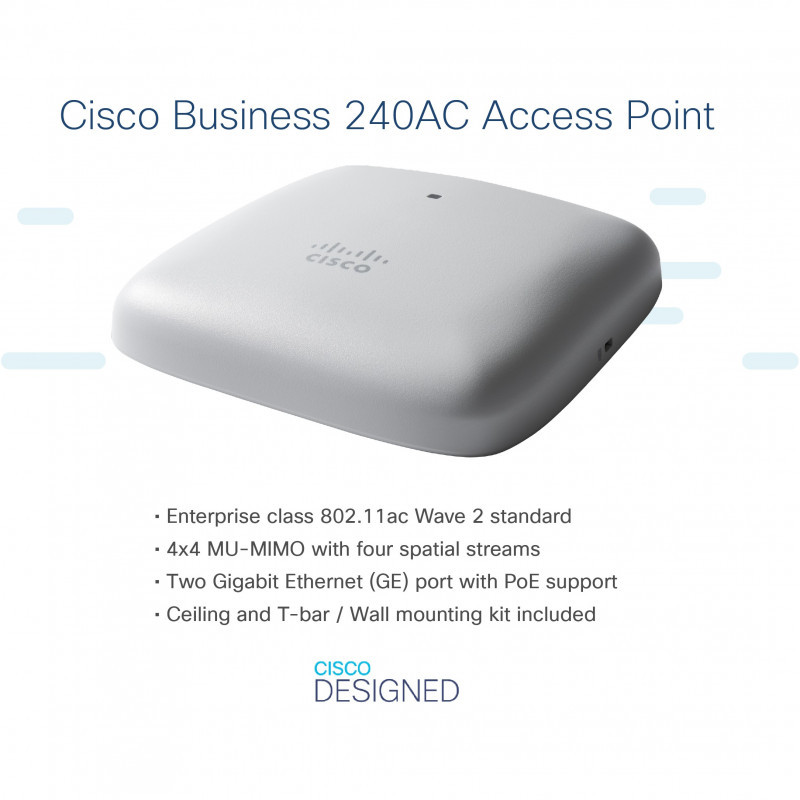 "Cisco Business 240AC 802.11ac 4x4 Wave 2 Access Point 2 GbE Ports - Ceiling Mount, Limited Lifetime Protection (CBW240AC-E). 2.4 GHz, 5 GHz, Maximum data transfer rate: 1733 Mbit/s. Security algorithms: WPA, WPA2, WPA3, WPA2-Enterprise. Ethernet LAN data rates: 10,100,1000 Mbit/s. Power over Ethernet (PoE). Product colour: Grey"\n"The Cisco Business 240AC Access Point delivers high density MU-MIMO (4x4) wireless connectivity for small offices. Designed with simplicity, flexibility and security in mind, the Cisco Business 240AC provides superior performance and enhanced range for an optimal user experience.