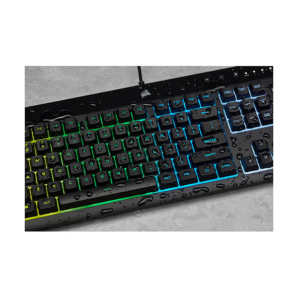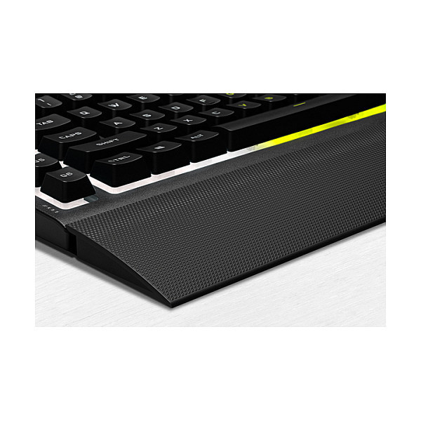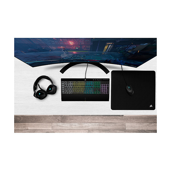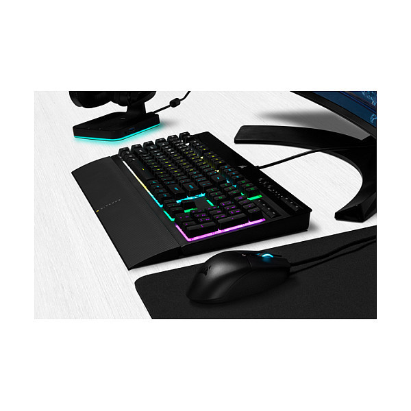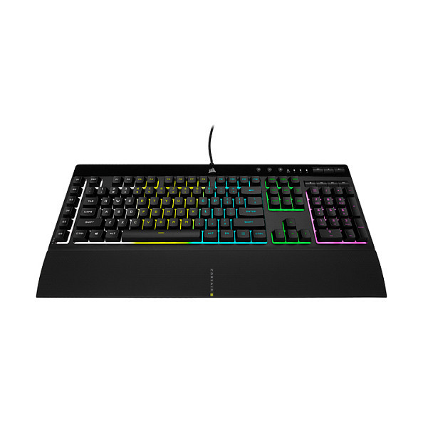 "Corsair K55 RGB PRO. Keyboard form factor: Full-size (100%). Keyboard style: Straight. Connectivity technology: Wired, Device interface: USB, Keyboard layout: AZERTY. Backlight type: RGB LED, Wrist rest. Recommended usage: Gaming. Product colour: Black"\n"The CORSAIR K55 RGB PRO Gaming Keyboard lights up your desktop with five-zone dynamic RGB backlighting and powers up your gameplay with six dedicated macro keys.
