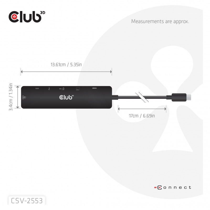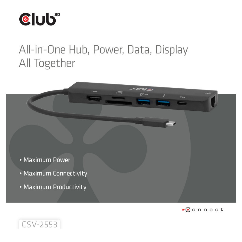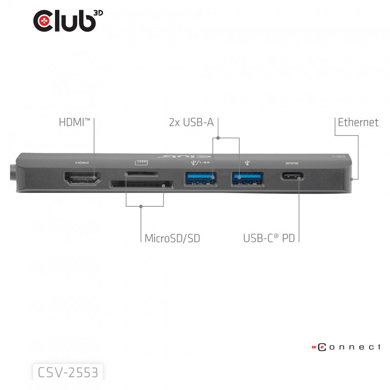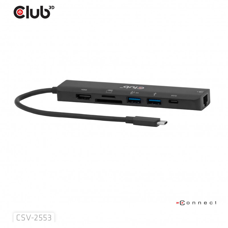 "CLUB3D CSV-2553. Host interface: USB Type-C, Hub interfaces: HDMI, RJ-45, USB 2.0 Type-A, USB Type-C, Compatible memory cards: MicroSD (TransFlash), SD. Data transfer rate: 5000 Mbit/s, Maximum refresh rate: 60 Hz, Supported graphics resolutions: 3840 x 2160. Ethernet interface type: Gigabit Ethernet, Ethernet LAN data rates: 10,100,1000 Mbit/s. Power supply type: USB. Windows operating systems supported: Windows 11, Mac operating systems supported: Mac OS X 15.0 Sequoia"\n"The Club 3D CSV-2553 is a USB Type-C®, 7-in-1 hub with HDMI™, 2x USB Type A, RJ45, microSD/SD card slots and Type-C® female port, providing an ideal solution for extending the port of USB Type-C® or Thunderbolt™ 3 host (PC/Laptop/tablet/Mobile phone, etc.)specially for the host with a single USB Type-C® port.