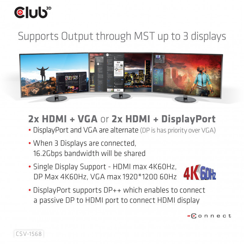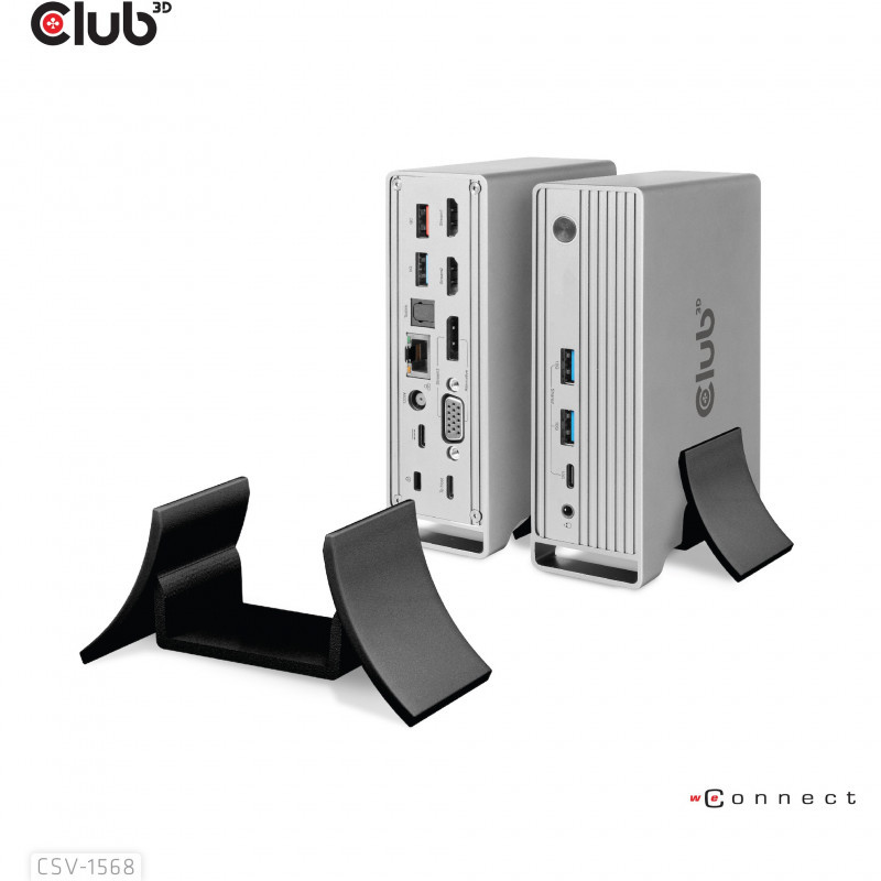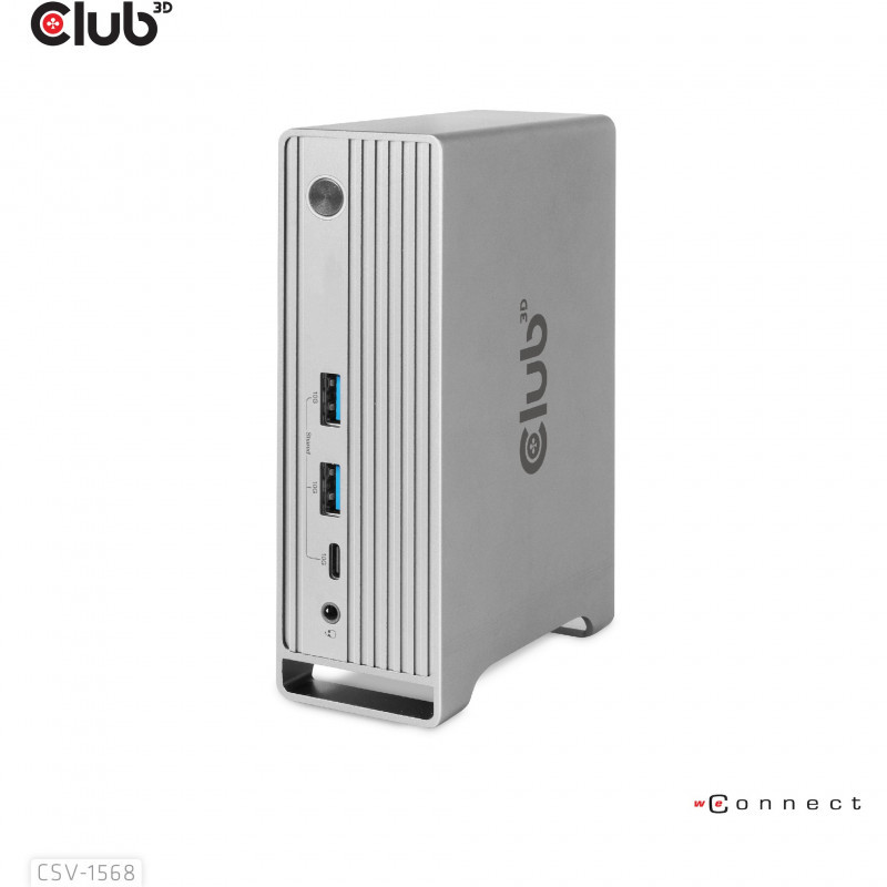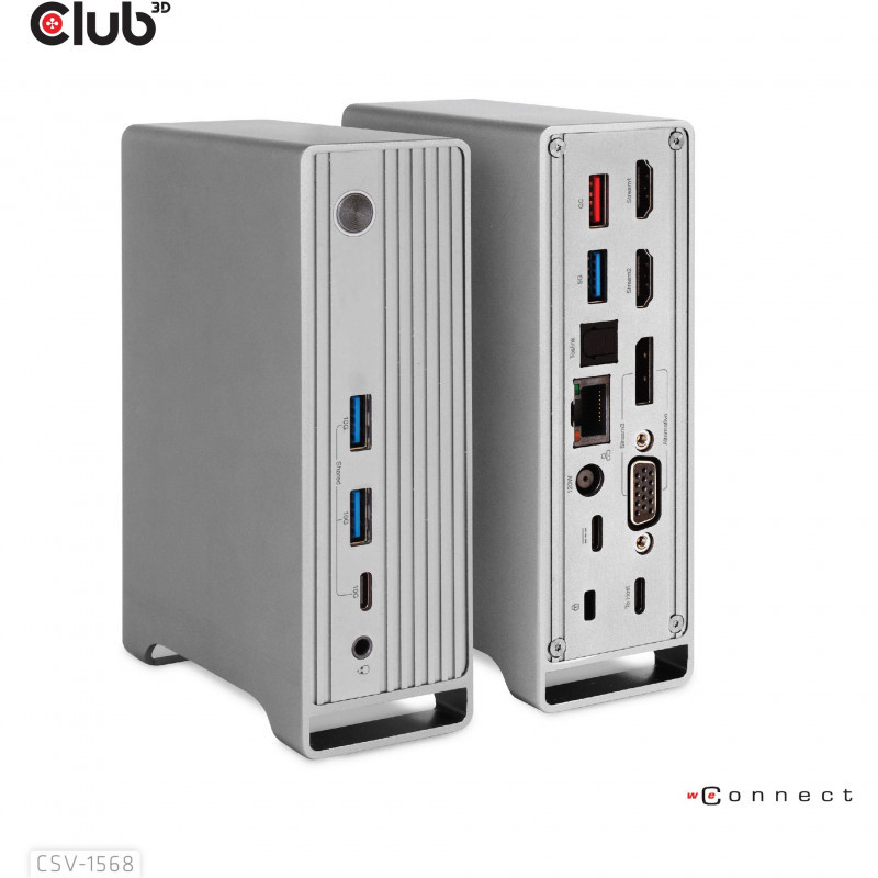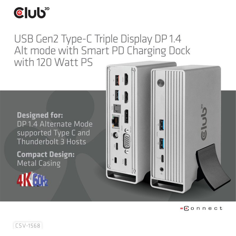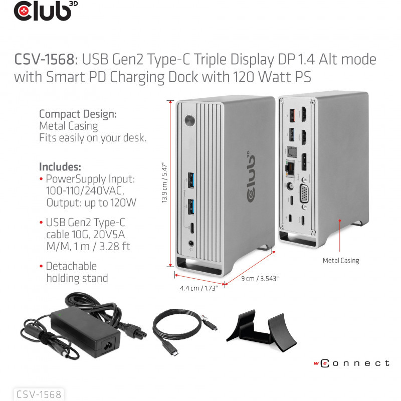 "CLUB3D Docking station(Metal casing)1x USB Gen2 Type-C Female (data) 2x USB Gen2 Type-A Female 1x USB Gen1 Type-A Female 1x USB Type-A (RED) Smart Charging port 5V/2.4A Max. • 2x HDMI™ (DP Alt Mode) 1x DP™ (DP Alt Mode) hdr 1x VGA 1x RJ45 1 + 120 Watt. Connectivity technology: Docking, Host interface: USB 3.2 Gen 2 (3.1 Gen 2) Type-C, USB Power Delivery up to: 100 W. Product colour: Metallic, Data transfer rate: 16.2 Gbit/s, Maximum refresh rate: 60 Hz. Power source type: DC, Power connector: USB Type-C, AC input voltage: 100 - 240 V. Width: 139 mm, Depth: 90 mm, Height: 44 mm. Quantity per pack: 1 pc(s), Package width: 225 mm, Package depth: 155 mm"\n"