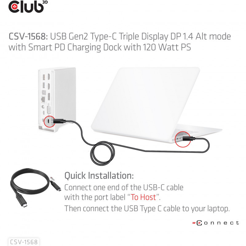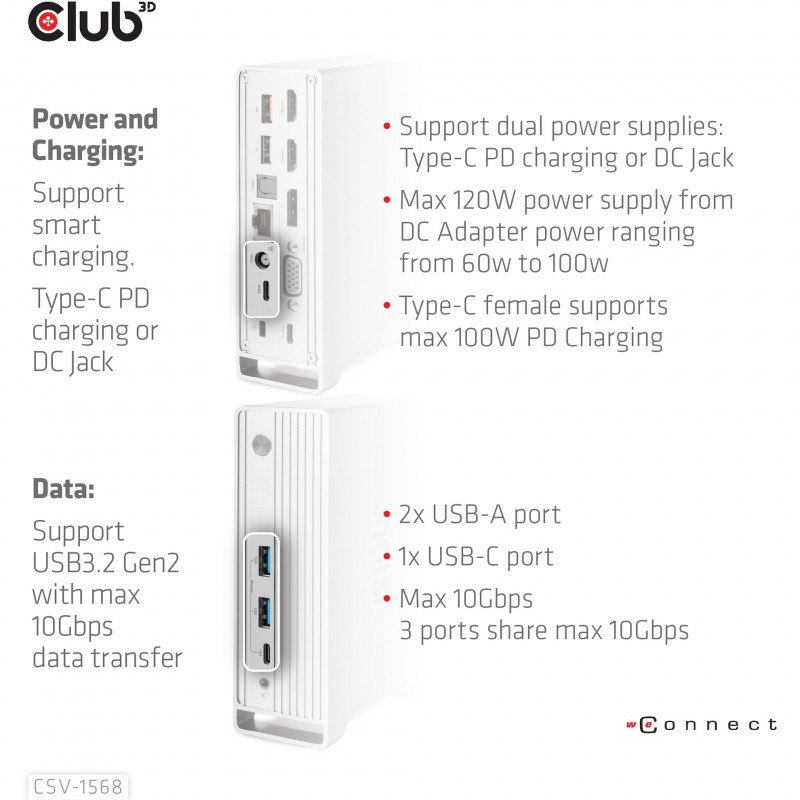 The Club 3D CSV-1568 USB Gen2 Type-C Triple Display DP™ Alt mode + Smart PD Charging Dock with 120 Watt PSU, is an integrated solution combining Video, Data, Power, Ethernet and Audio. It has 4 videos (output 3 videos simultaneously under MST mode) for video transmission, 4 USB data ports (2 USB-A 10G, 1 Type-C 10G, 1 USB-A 5G) for data transmission, 1 USB-A smart charging port for quick charging, 1 Gigabit Ethernet for super fast Ethernet, 2 audio ports (3.5mm audio, Toslink) for enjoying music. Besides, this dock is equipped with dual power jack (Type-C PD Charging or 120W DC power supply).