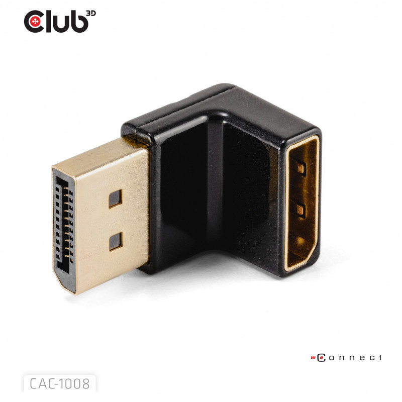 "CLUB3D DisplayPort Male to DisplayPort 1.4 Female 90 Degree Angled Adapter 4K120Hz M/F. Connector 1: DisplayPort, Connector 2: DisplayPort. Product colour: Black"\n"The Club 3D CAC-1008 DisplayPort™ Male to DisplayPort™ 1.4 Female 90 Degree Angled Adapter 4K120Hz M/F is a versatile angle connector adapters providing cable management solutions. With this adapter you can avoid blocking other ports on your host device. Also for displays with a tight location on the DisplayPort™ input this can be an easy fix for not blocking other ports and/or bending cables. This set contains 1 of adapter and is universal in their usage for supporting display resolutions of up to 4096*2160 at 120Hz or 7680*4320 at 30Hz . The adapters are verified with Club 3D products to support these resolutions. Its important that the source and display should support DP™1.4 and the cables are also designed to support this bandwidth.