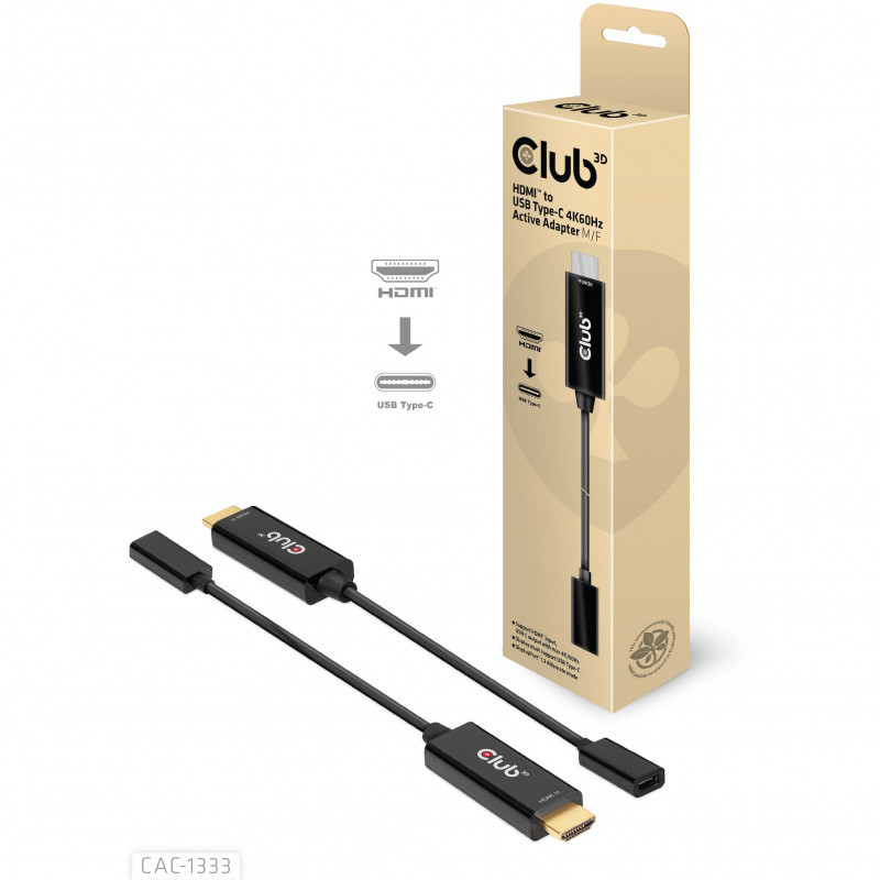 "CLUB3D HDMI to USB Type-C 4K60Hz Active Adapter M/F. Cable length: 0.22 m, Connector 1: HDMI Type A (Standard), Connector 2: USB Type-C. Certification: • Meets ROHS, FCC, and CE EMI requirements Note: - Please update your TV Firmware to the version.... Plastic packaging weight: 8 g, Paper/cardboard packaging weight: 28 g, Total plastic packaging weight: 120 g. Weight: 22 g. Package width: 60 mm, Package depth: 240 mm, Package height: 35 mm"\n"The Club 3D CAC-1333 is a HDMI™ to USB-C Adapter which allows you to transmit signal from HDMI™ source (Laptop, tablet, PC etc.) to USB-C display devices(TV, monitor, projector, etc.) through a Type-C M/M Cable. This adapter is Uni-Directional it only works from an HDMI™ Source device to an USB C DP™ 1.2 Alternate mode supported display. This product supports DP™1.2 specification with resolution up to 4096 x 2160@60Hz."
