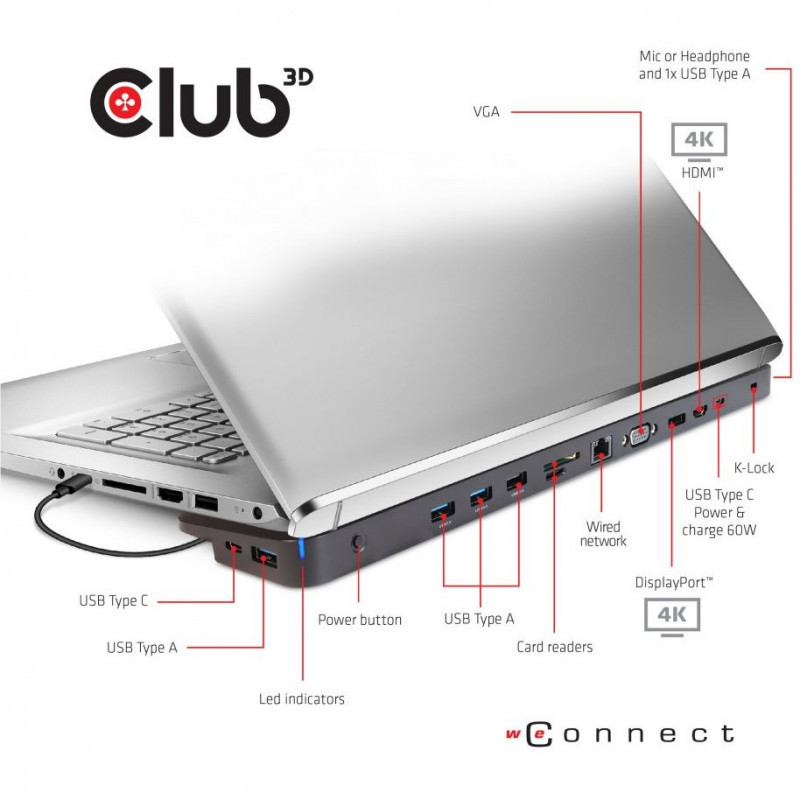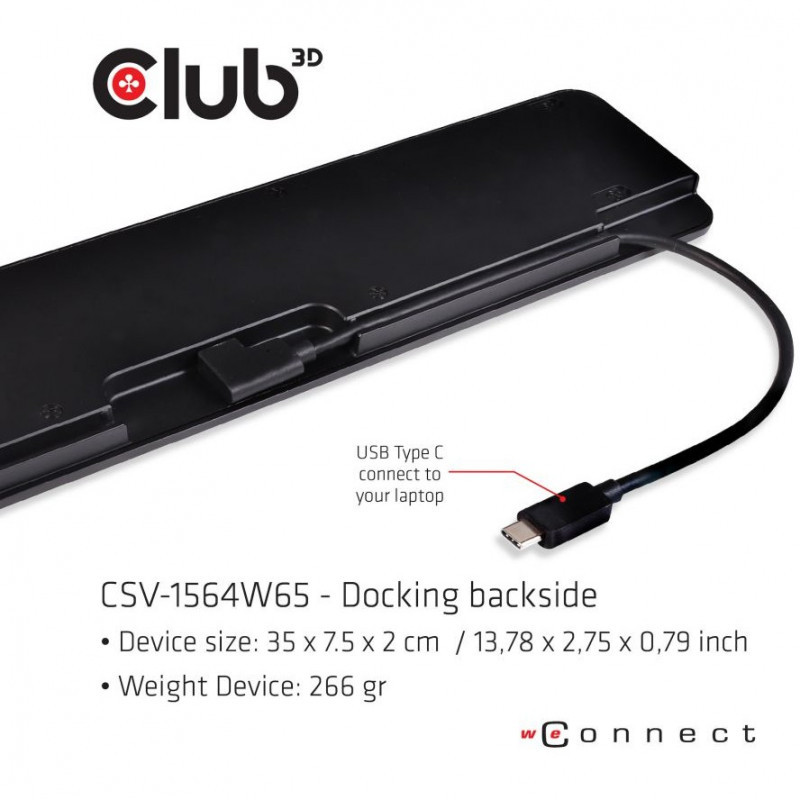 "CLUB3D UNIVERSAL USB Gen1 Type-C Triple Display Dynamic PD Charging Dock with 65 Watt PS ( VGA, HDMI, DP, ETHERNET). Connectivity technology: Docking, Host interface: USB 3.2 Gen 1 (3.1 Gen 1) Type-C, Headphone connectivity: 3.5 mm. Ethernet LAN data rates: 1000 Mbit/s, Copper ethernet cabling technology: 1000BASE-TX, Networking standards: IEEE 802.3. Product colour: Black, Compatible memory cards: MicroSD (TransFlash), HD type: 4K Ultra HD. Power source type: AC, Power connector: USB Type-C, Power supply: 100 W. Width: 350 mm, Depth: 75 mm, Height: 20 mm"\n"The Club 3D CSV-1564W65 USB Gen1 Type-C Triple Display Dynamic PD Charging Dock is an integrated solution combining Video, Data, Power, Ethernet and Audio especially for frequent travelers. The Three different Video ports (HDMI™, DisplayPort™, VGA) allow you to enjoy 3 different images or videos on 3 different displays simultaneously under MST mode. The USB Type-A ports and USB Type-C data port allow you to connect multiple USB devices to the host. The USB Type-C charging port allows you to provide power for this Dock and can charge the host PC at the same time by connecting a PD power Adapter, no need to carry your notebooks' power supply. So in general the user is traveling lighter. The Micro SD and SD/MMC ports allow you to read the information in the memory card onto the host. The 3.5mm audio port allows enjoying the music of the host via a headset. Besides, with the Gigabit Ethernet port, you can enjoy high speed Ethernet on the host. It supports all DP Alt mode supported hosts (PC, laptop, mobile phone, etc.), Dynamic Current Detection and Power Distribution, the product no longer intercepts the fixed power from the external PD Power Supply, but intercepts it according to the actual power consumed by itself, so that the PC can be dynamically charged more power. For Video Signal the source device needs to support DisplayPort™ Alt Mode.