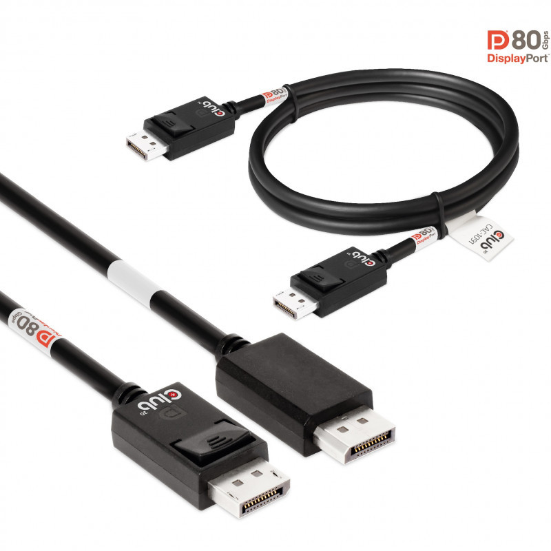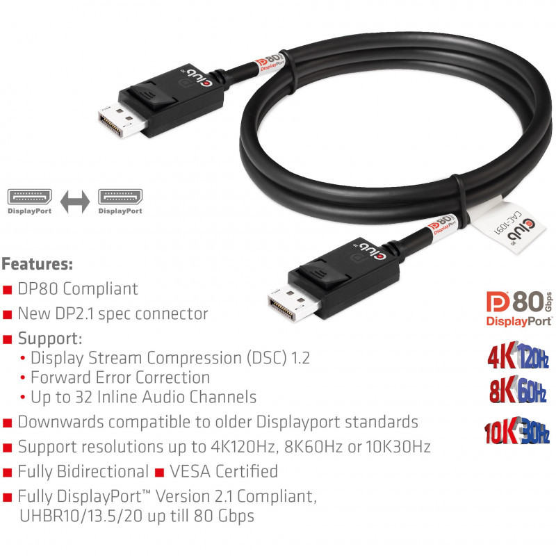 "CLUB3D DisplayPort 2.1 Bi-Directional VESA DP80 Certified Cable 4K240Hz, 8K60Hz or 10K30Hz M/M 1.2m/3.94ft. Cable length: 1.2 m, Connector 1: DisplayPort, Connector 2: DisplayPort. Certification: Meets ROHS, FCC, and CE EMI requirements"\n"The Club 3D CAC-1091 DisplayPort™ 2.1 Cable enables the connection of your
