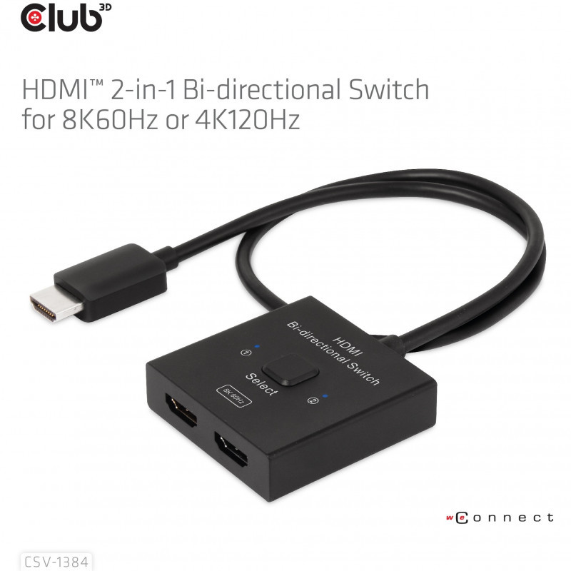 "CLUB3D HDMI 2-in-1 Bi-directional Switch for 8K60Hz or 4K120Hz. Paper/cardboard packaging weight: 45 g, Plastic packaging weight: 2 g. Harmonized System (HS) code: 8473 3020"\n"The Club 3D CSV-1384 is a HDMI™ 2-in-1 Bi-directional Switch for 8K60Hz or 4K120Hz. It can switch either of two sources to one display or switch one source to either of two displays. Press the switch button to select channel 1 or channel 2. With a piece of 0.5m / 1.64 ft length fixed HDMI™ cable (pigtail), this Switch not only reduces cost but also saves time for customers. This kind of HDMI™ Switcher routes high definition video (in multiple resolutions and up to 8K60Hz) and digital audio from the sources to display units."