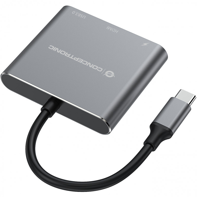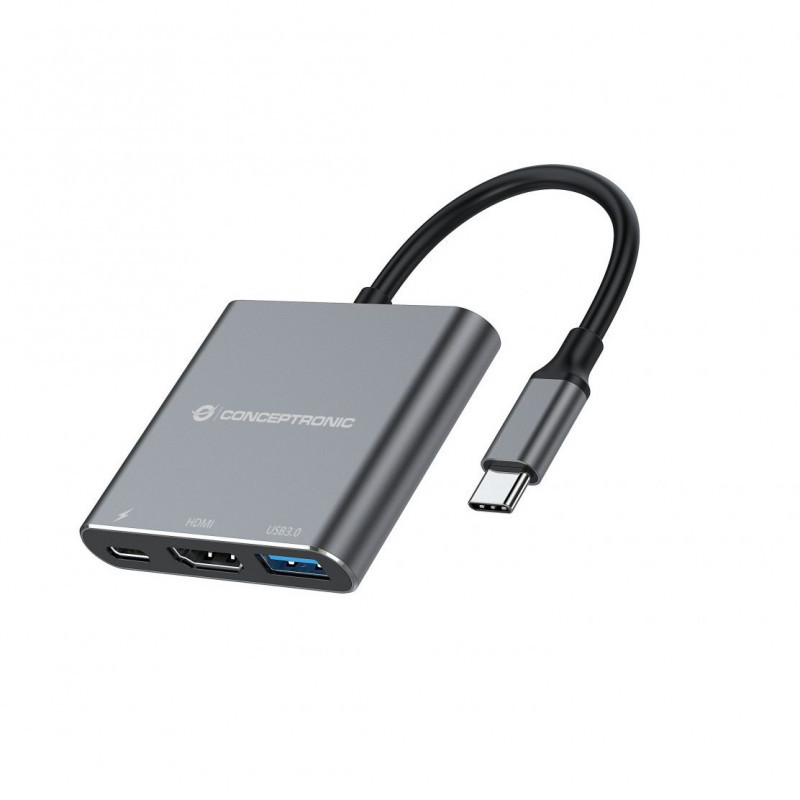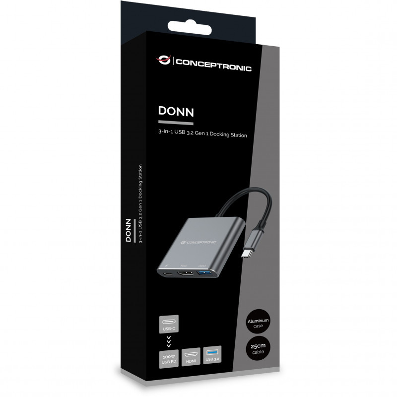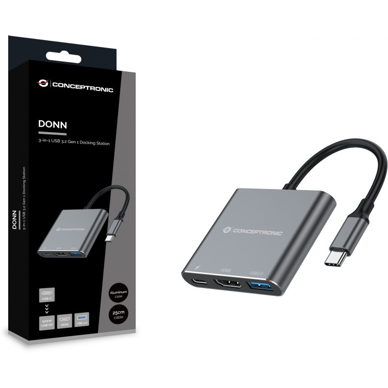 "Conceptronic DONN18G 3-in-1 USB 3.2 Gen 1 Docking Station, HDMI, USB 3.0, 100W USB PD. Connectivity technology: Wired, Host interface: USB 3.2 Gen 1 (3.1 Gen 1) Type-C, USB Power Delivery up to: 100 W. Product colour: Grey, Data transfer rate: 5 Gbit/s, HD type: 4K Ultra HD. Power source type: USB, USB cable length: 0.25 m. Other operating systems supported: ChromeOS. Width: 58 mm, Depth: 52 mm, Height: 12 mm"\n"This 3-in-1 USB-C to HDMI Adapter makes it possible to expand your device’s USB Type-C capacity with HDMI/USB-C PD/USB 3.0 ports. The adapter provides an easy way to add HDTV, or equipment such as a monitor or projector to any USB-C device such as a smartphone, portable gaming console, MacBook, Chromebook Pixel or any similar late-model laptop with USB-C ports. Perfect for home entertainment, office presentations and classroom teaching."