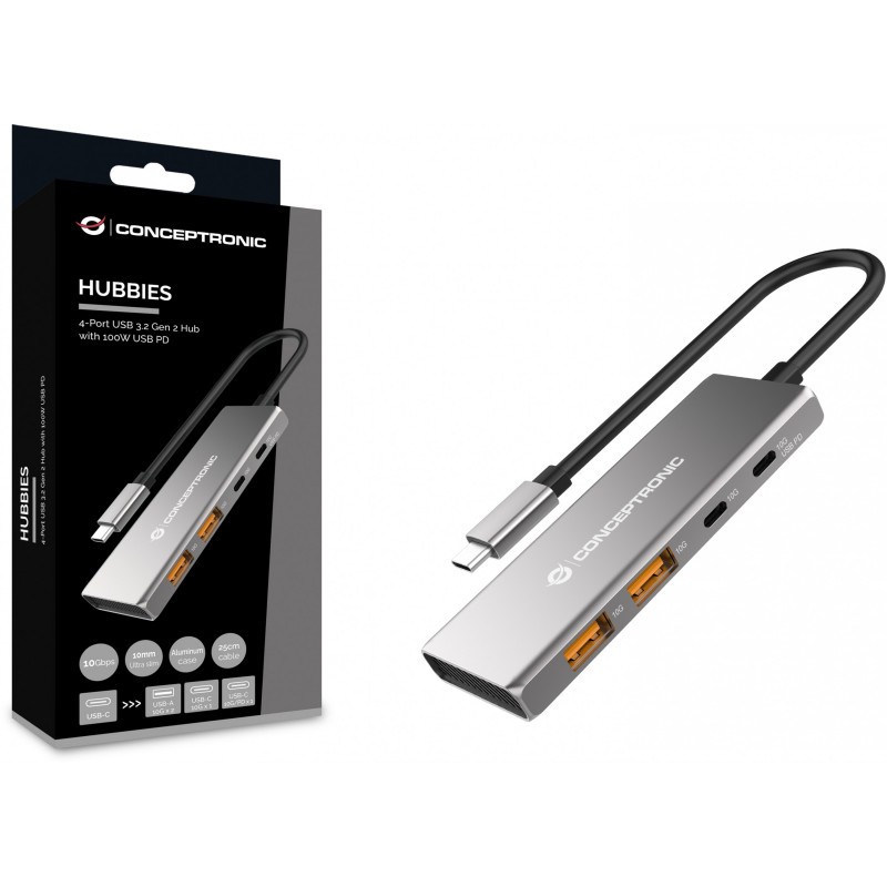 "Conceptronic HUBBIES15G. Host interface: USB 3.2 Gen 2 (3.1 Gen 2) Type-C, Hub interfaces: USB 3.2 Gen 2 (3.1 Gen 2) Type-A, USB 3.2 Gen 2 (3.1 Gen 2) Type-C. Data transfer rate: 10000 Mbit/s, Product colour: Grey, Housing material: Aluminium. Windows operating systems supported: Windows 10, Windows 11, Windows 7, Windows 8, Windows Vista, Windows XP, Mac operating systems supported: Mac OS X 10.10 Yosemite, Mac OS X 10.11 El Capitan, Mac OS X 10.12 Sierra, Mac OS X 10.13 High..., Other operating systems supported: Android. Width: 43 mm, Depth: 117 mm, Height: 10 mm. Quantity per pack: 1 pc(s), Package width: 85 mm, Package depth: 160 mm"\n"This 4-port USB 3.2 Gen 2 hub makes it possible to expand your device’s USB-C capacity with 4 extra USB ports!