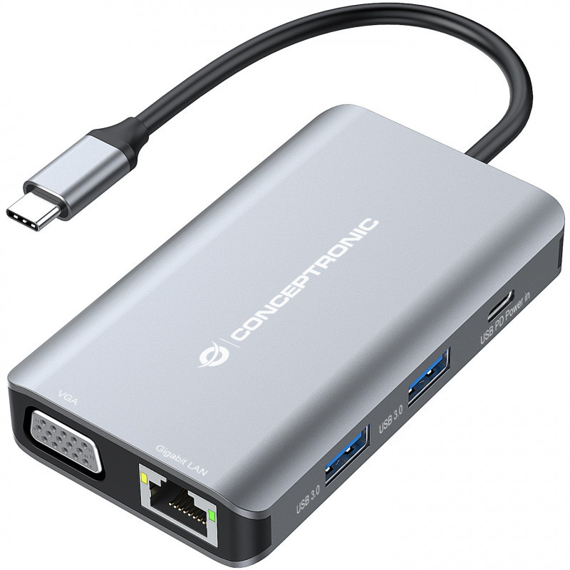 "Conceptronic DONN21G. Connectivity technology: Wired, Host interface: USB 3.2 Gen 1 (3.1 Gen 1) Type-C, USB Power Delivery up to: 100 W. Ethernet LAN data rates: 1000 Mbit/s. Product colour: Grey, HD type: 4K Ultra HD, Maximum digital resolution: 3840 x 2160 pixels. Power cable length: 0.2 m. Windows operating systems supported: Windows 10, Windows 11, Windows 7, Windows 8, Windows Vista, Windows XP, Mac operating systems supported: Mac OS X 10.10 Yosemite, Mac OS X 10.11 El Capitan, Mac OS X 10.12 Sierra, Mac OS X 10.13 High..., Other operating systems supported: Android, ChromeOS"\n"This 7-in-1 Docking Station makes it possible to expand your device’s USB Type-C capacity with HDMI/VGA/USB-C PD/USB 3.0/GbE ports. The docking station provides an easy way to add HDTV, or equipment such as a monitor or projector to any USB-C device such as a smartphone, portable gaming console, MacBook, Chromebook Pixel or any similar late-model laptop with USB-C ports. The multiport video adapter lets you mirror or extend content on two additional monitors simultaneously (1 x HDMI, 1 x VGA), creating a dual-screen workstation. Perfect for home entertainment, office presentations and classroom teaching."