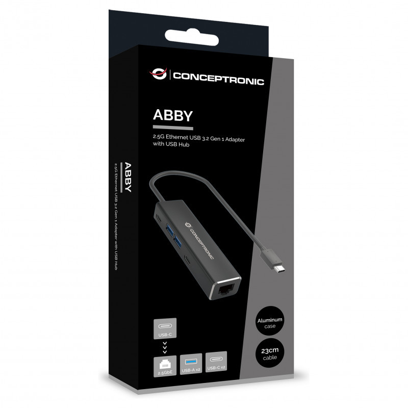 "Conceptronic ABBY14B 2.5G Ethernet USB 3.2 Gen 1 Adapter with USB Hub, 2.5GbE, USB-A x 2, USB-C x 2. Connectivity technology: Wired, Host interface: USB 3.2 Gen 1 (3.1 Gen 1) Type-C. Ethernet LAN data rates: 10,100,1000,2500 Mbit/s, Networking standards: IEEE 802.1Q, IEEE 802.1p, IEEE 802.3, IEEE 802.3ab, IEEE 802.3az, IEEE 802.3bz, IEEE 802.3u. Product colour: Grey, Housing material: Aluminium, Country of origin: China. Power source type: USB, USB cable length: 0.23 m. Windows operating systems supported: Windows 10, Windows 10 Education, Windows 10 Education x64, Windows 10 Enterprise, Windows 10..., Mac operating systems supported: Mac OS X 10.10 Yosemite, Mac OS X 10.11 El Capitan, Mac OS X 10.12 Sierra, Mac OS X 10.13 High..., Mobile operating systems supported: Android 10.0, Android 11.0, Android 12.0, Android 13.0, Android 5.0, Android 5.1, Android 6.0,..."\n"The 2.5G Ethernet USB 3.2 Gen 1 Adapter with USB Hub allows you to connect to the internet easily through the built-in USB port on your laptop. This is an ideal solution for MacBook or other Windows computers that may have wireless built-in but don’t come with an Ethernet port. With its 2.5 Gigabit Ethernet connection, it enables lightning-fast data transfers, at speeds 2.5 times faster than Gigabit Ethernet. The adapter also combines a regular USB hub. So you can connect external USB peripherals, such as an MP3 player, digital camera, printer, or pen drive.