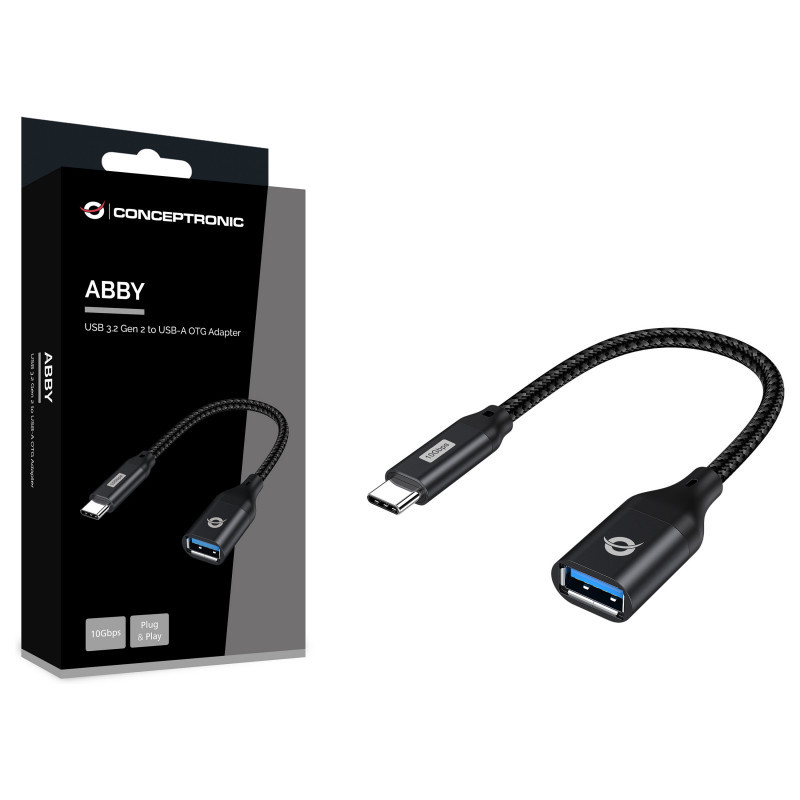 "Conceptronic ABBY18B USB 3.2 Gen 2 to USB-A OTG Adapter. Connector 1: USB-C, Connector 2: USB-A. Product colour: Black"\n"This USB-C OTG Adapter provides convenient data syncing and charging to any USB-C device such as a smartphone, portable gaming console, MacBook, Chromebook Pixel or any similar late-model laptop with USB-C ports. The adapter also provides a means of connecting devices such as external hard drives, USB flash drive or a mouse and keyboard using your existing cable, removing the need to purchase new equipment. Moreover, the adapter supports up to 3.0 Amps of power output for charging USB-C devices. A great economical choice to enhance daily life."