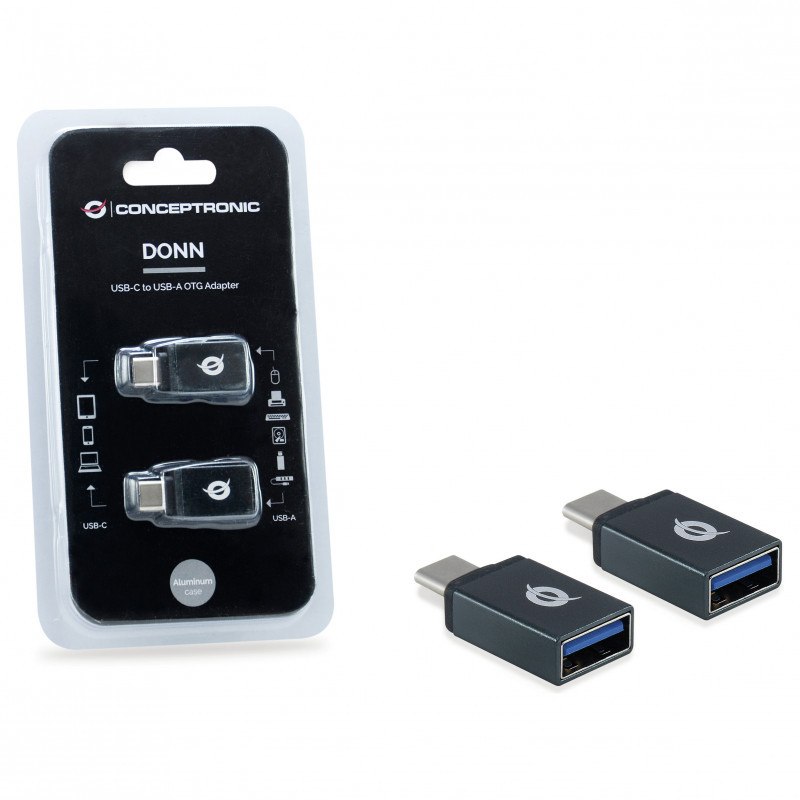 "Conceptronic DONN USB-C to USB-A OTG Adapter 2-Pack. Connector 1: USB 3.1 Gen 1 Type-C, Connector 2: USB 3.1 Gen 1 Type-A. Product colour: Black"\n"This USB-C OTG Adapter provides convenient data syncing and charging to any USB-C device such as a smartphone, portable gaming console, MacBook, Chromebook Pixel or any similar late-model laptop with USB-C ports. The adapter also provides a means of connecting devices such as external hard drives, USB flash drive or a mouse and keyboard using your existing cable, removing the need to purchase new equipment. A great economical choice to enhance daily life."