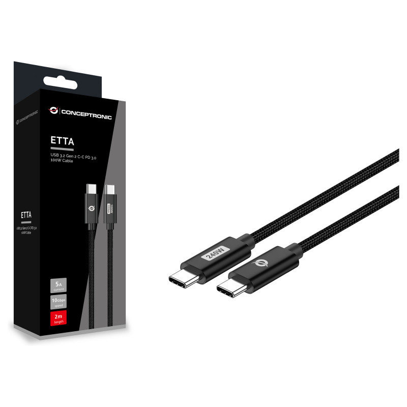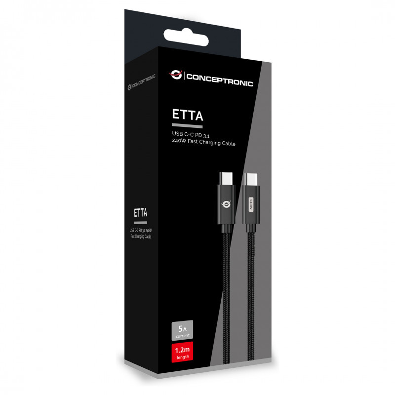 "Conceptronic ETTA03B12 USB C-C PD 3.1 240W Fast Charging Cable 1.2M, 48V 5A, 480Mbps, E-Mark. Cable length: 1.2 m. Connector 1: USB C, Connector 2: USB C, USB version: USB 2.0, Maximum data transfer rate: 0.48 Gbit/s, Product colour: Black"\n"The Conceptronic USB-C cable is the perfect companion for all your charging and data transfer needs! Designed with PD 3.1 technology and featuring an E-Mark chipset, this cable delivers up to 240W (48V/5A) of power, ensuring safe and efficient charging for your devices. The durable braided cable is designed to withstand twists and tugs, making it a reliable choice for tight spaces or on-the-go use. With a data transfer speed of 480Mbps, it efficiently handles your syncing needs. Whether you're at home, in the office, or on the move, this cable will meet all your connectivity needs, providing you with a seamless and efficient experience every time."