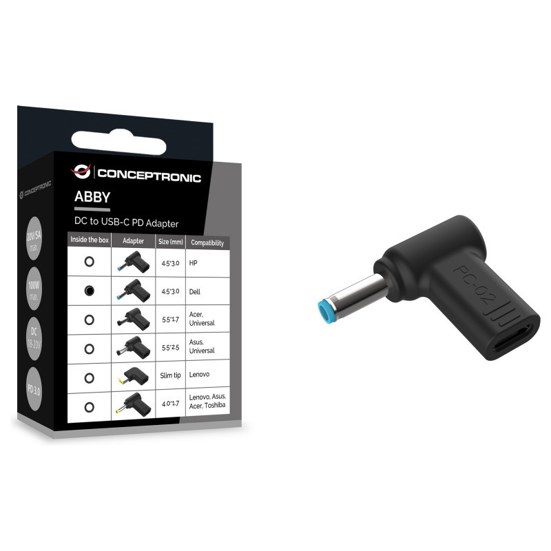 "Conceptronic ABBY15PC02 DC to USB-C Adapter, Dell 4.5x3.0mm, 18-20V. Product type: Laptop power tip, Product colour: Black, Brand compatibility: Dell. Input voltage: 18 - 20 V. Quantity per pack: 1 pc(s), Package width: 50 mm, Package depth: 25 mm. Width: 30 mm, Depth: 30 mm, Height: 6 mm. Pallet gross width: 120 cm, Pallet gross length: 80 cm, Pallet gross height: 152 cm"\n"This DC to USB-C adapter is designed for use with a USB-C PD charger, enabling connection to a Dell Laptop compatible with a 4.5x3.0mm DC connector.