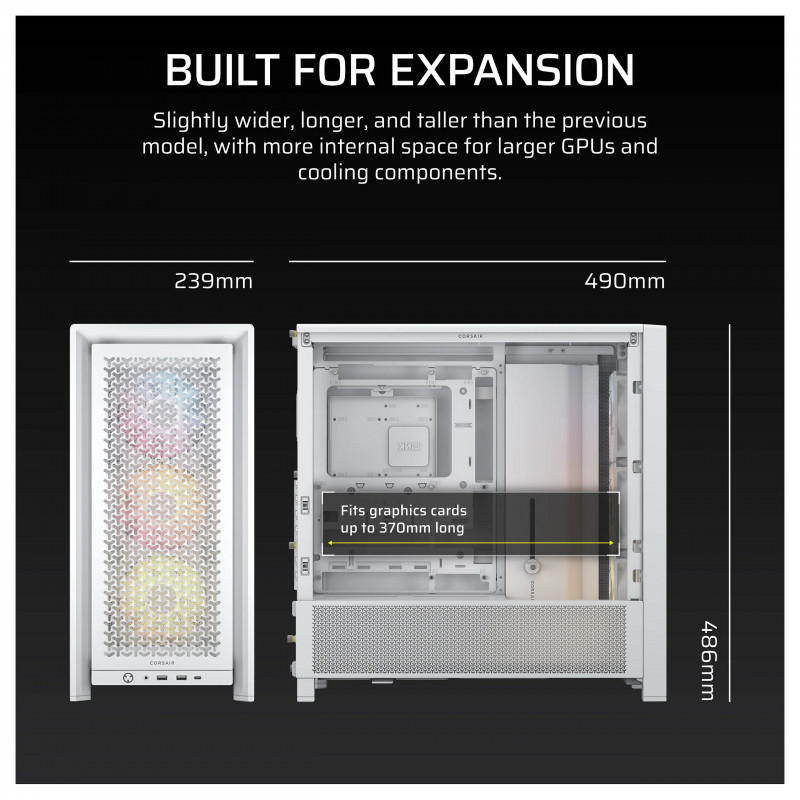 "Corsair FRAME 4000D RS ARGB. Form factor: Midi Tower, Type: PC, Product colour: White. Supported power supply form factors: ATX. Front fans installed: 3x 120 mm, Front fans diameters supported: 120,140,200 mm, Side fans diameters supported: 120,140 mm. Supported HDD sizes: 2.5,3.5"", SSD form factor: 2.5"". Width: 239 mm, Depth: 490 mm, Height: 486 mm"\n"GET READY FOR YOUR NEXT BUILD