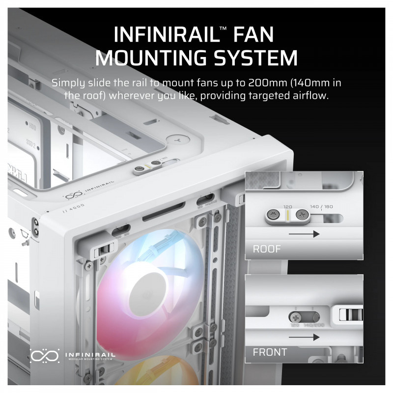 This steel multi-point mounting system provides unmatched flexibility for front and roof fan configurations. Easily slide the rail to mount fans up to 200mm (140mm in the roof) exactly where you need them, ensuring targeted airflow without limitations of fixed mounting points.