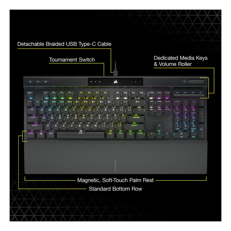AXON enables a new level of K70 performance, processing and transmitting your inputs up to 8x faster than conventional gaming keyboards with 8,000Hz hyper-polling, 4,000Hz key scanning, and up to 20 layers of hardware RGB lighting processing while maintaining speed performance.