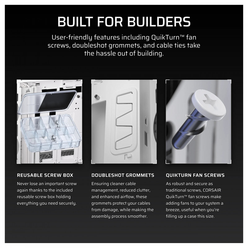 As robust and secure as traditional screws, CORSAIR QuikTurn™ fan screws make adding fans to your system a breeze, useful when you’re filling up a case this size.