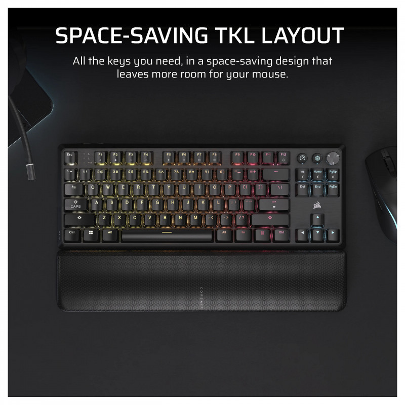 "Corsair K70 CORE TKL. Keyboard form factor: Tenkeyless (80 - 87%). Keyboard style: Curved. Connectivity technology: Wired & Wireless, Device interface: USB + RF Wireless + Bluetooth, Keyboard key switch: Mechanical, Keyboard layout: QWERTZ, Keyboard number of keys: 88. Backlight type: RGB LED, Wrist rest. Recommended usage: Gaming. Product colour: Black"\n"SPACE-SAVING TKL LAYOUT