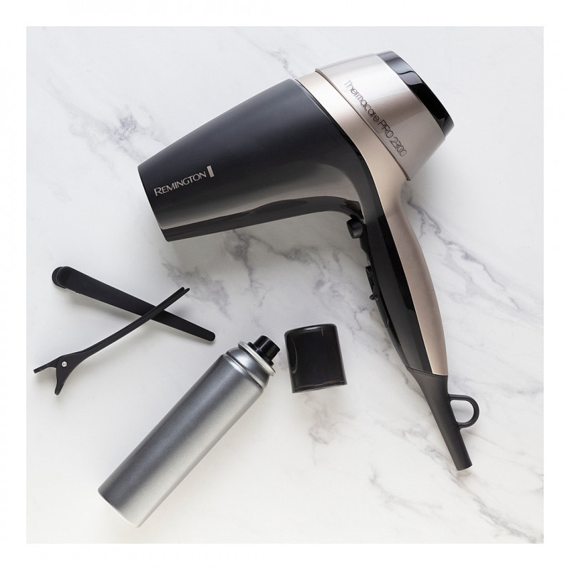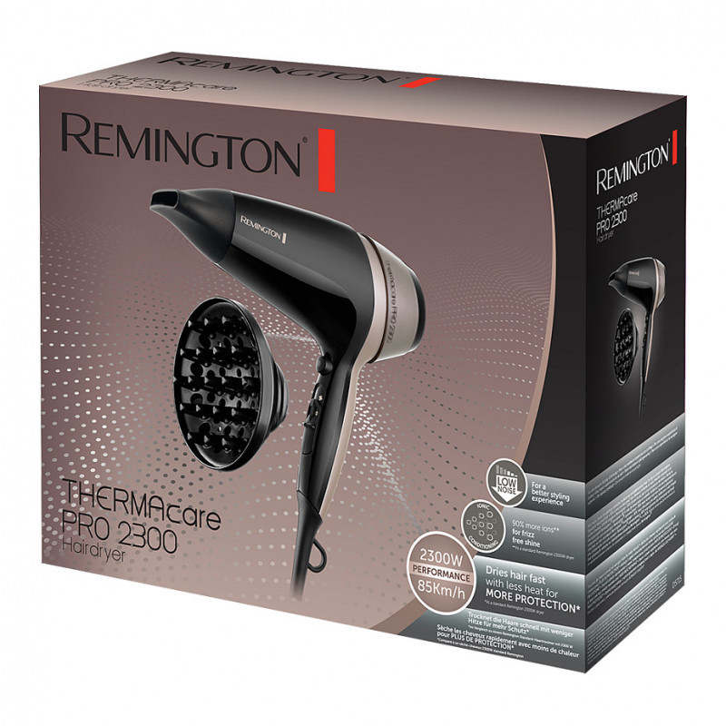 "Remington Thermacare Pro 2300. Air speed: 23.6 m/s. Product colour: Black, Brown, Hanging type: Hanging loop. Power: 2300 W, Power consumption (typical): 2100 W"\n"The Thermacare Pro 2300 offers the combination of fast drying with more protection As a powerful yet gentle 2100W dryer, it offers the same drying speed as a 2300W dryer but with less heat, for more protection.