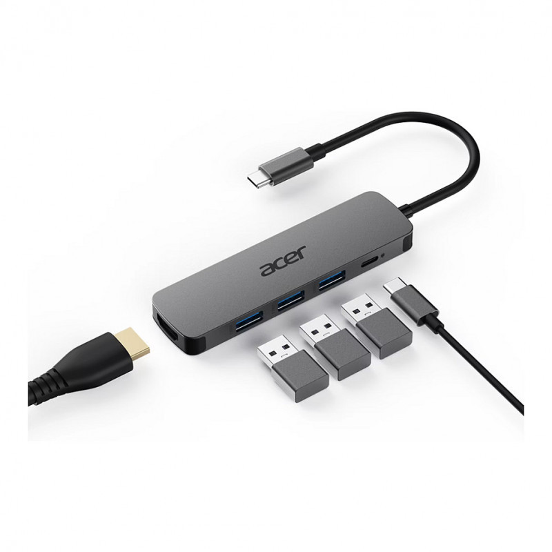 "Acer 5in1 Type C Dongle. Connectivity technology: Wired, Host interface: USB 3.2 Gen 1 (3.1 Gen 1) Type-C, USB Power Delivery up to: 100 W. Product colour: Silver, Maximum digital resolution: 3840 x 2160 pixels, Maximum refresh rate: 60 Hz. Other operating systems supported: ChromeOS. Width: 30 mm, Depth: 110 mm, Height: 10.5 mm"\n"Perfect little companion
