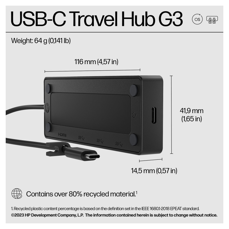"HP USB-C Travel Hub G3. Host interface: USB 3.2 Gen 2 (3.1 Gen 2) Type-C, USB Power Delivery up to: 65 W. Maximum refresh rate: 60 Hz, Hub interfaces: HDMI, USB 3.2 Gen 2 (3.1 Gen 2) Type-A, USB 3.2 Gen 2 (3.1 Gen 2) Type-C, Country of origin: Vietnam. Windows operating systems supported: Windows 10, Windows 11, Mac operating systems supported: MacOS, Other operating systems supported: ChromeOS, Android, iPadOS. Width: 116 mm, Depth: 41.9 mm, Height: 14.5 mm. Package width: 175 mm, Package depth: 60 mm, Package height: 40 mm"\n"Connect. Charge. Go