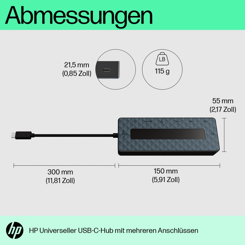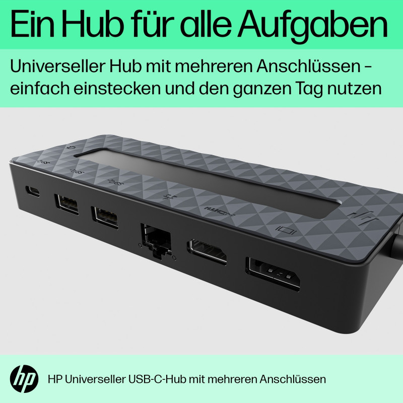 "HP Universal USB-C Multiport Hub. Connectivity technology: Wired, Host interface: USB 3.2 Gen 1 (3.1 Gen 1) Type-C, USB Power Delivery up to: 65 W. Ethernet LAN data rates: 10,100,1000 Mbit/s. Product colour: Black, Colour name: Black, Hub interfaces: DisplayPort, HDMI, RJ-45, USB 3.2 Gen 1 (3.1 Gen 1) Type-A, USB 3.2 Gen 1 (3.1 Gen 1) Type-C. Power supply type: USB, USB cable length: 0.3 m. Windows operating systems supported: Windows 10, Windows 11, Mac operating systems supported: MacOS, Other operating systems supported: ChromeOS"\n" A Hub That Does it All
