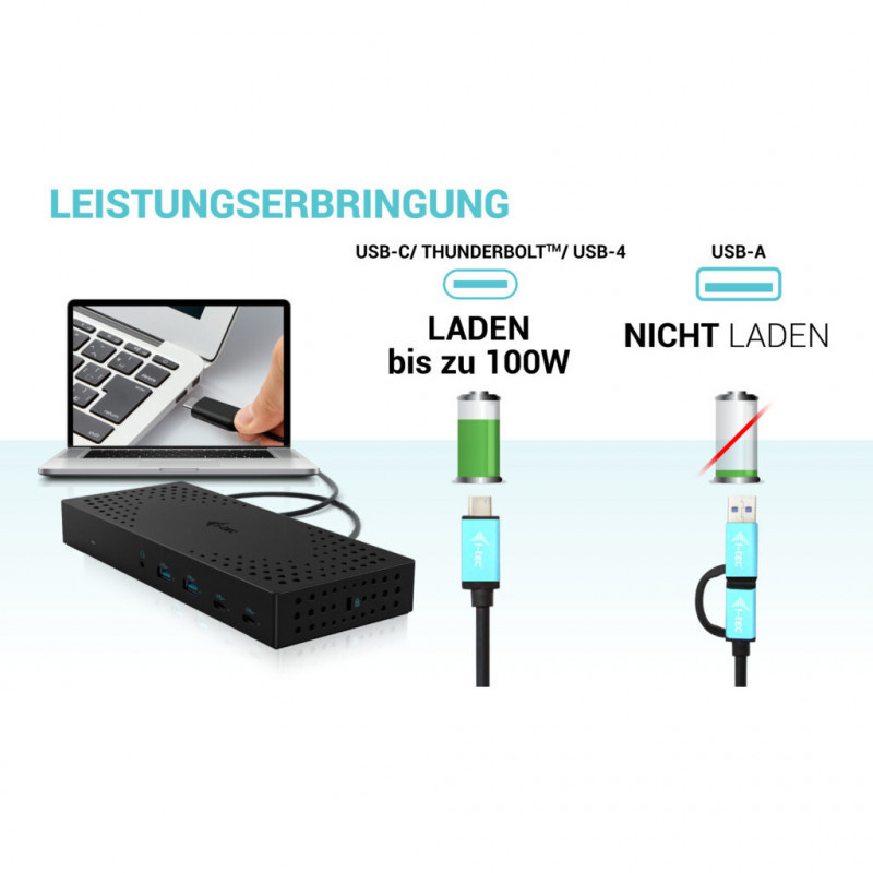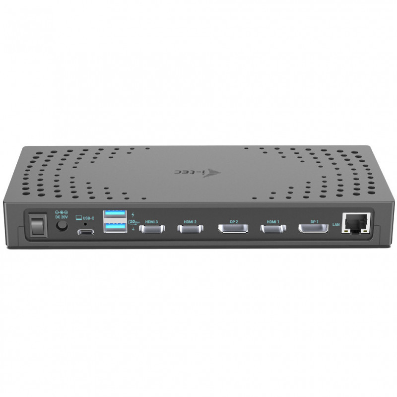"i-tec USB 3.0 / USB-C / Thunderbolt, 3x 4K Docking Station Gen 2 + Power Delivery 100W. Connectivity technology: Wired, Host interface: USB 3.2 Gen 2 (3.1 Gen 2) Type-C, USB Power Delivery up to: 100 W. Ethernet LAN data rates: 10,100,1000 Mbit/s. Product colour: Grey, Data transfer rate: 10 Gbit/s, Maximum refresh rate: 60 Hz. Output voltage: 20 V, Output current: 8 A, Compatible power plug types: EU. Other operating systems supported: Android, ChromeOS"\n"A powerful professional docking station Gen 2 that supports output to up to three external monitors in up to 4K high resolution. The dock can be used with virtually all notebooks as it supports connection to all common ports: USB 3.0, USB-C and Thunderbolt” 3/4, while supporting all common current operating systems. However, connection to three monitors will only be possible if the laptop has a Thunderbolt” 3/4 port or a USB-C port that supports video transfer (USB-C DP Alt mode). If connected to notebook with USB 3.0 port, only two monitors will be supported.