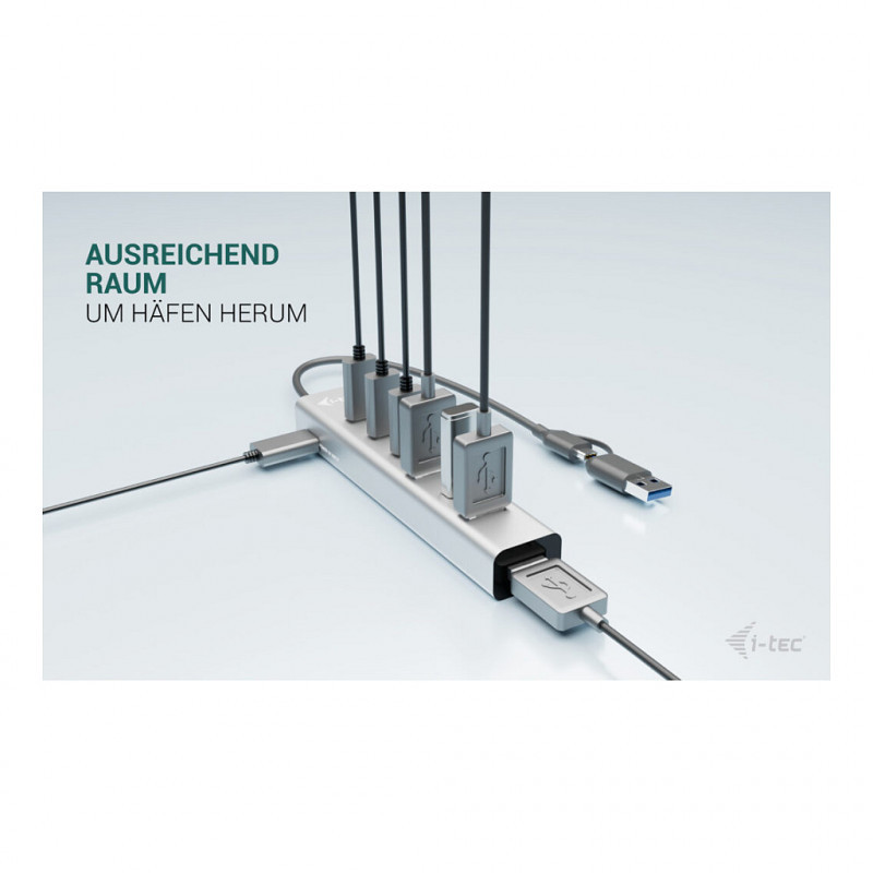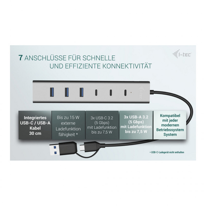 "i-tec USB-C/USB-A Charging Metal HUB 7 port (3x USB-C, 4x USB-A). Host interface: USB 3.2 Gen 1 (3.1 Gen 1) Type-A + Type-C, Hub interfaces: USB 3.2 Gen 1 (3.1 Gen 1) Type-A, USB 3.2 Gen 1 (3.1 Gen 1) Type-C. Data transfer rate: 5 Mbit/s, Product colour: Grey, Cable length: 0.3 m. Power consumption (max): 15 W. Other operating systems supported: Android, ChromeOS, iPadOS. Width: 157 mm, Depth: 30 mm, Height: 21 mm"\n"USB-A, USB-C, USB4 and Thunderbolt 3 or 4 are becoming increasingly popular on today’s laptops and tablets. Along with their increasing use, the number of USB ports on the body of laptops is decreasing. And if you need to connect accessories to your device that don’t have enough ports anymore, you can use this small but handy hub that also supports active charging.