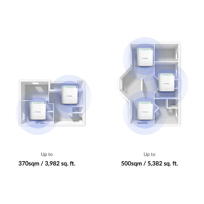 "D-Link EAGLE PRO AI AX1500 Mesh System - 3 Pack. Product colour: White, Antenna type: Internal, Product type: Mesh system. Wi-Fi band: Dual-band (2.4 GHz / 5 GHz), Top Wi-Fi standard: Wi-Fi 6E (802.11ax), Wi-Fi standards: 802.11a, 802.11b, 802.11g, Wi-Fi 4 (802.11n), Wi-Fi 5 (802.11ac), Wi-Fi 6 (802.11ax). Virtual assistant: Amazon Alexa & Google Assistant, Firewall security: DoS, Stateful Packet Inspection, Anti-spoofing Checking, IP/MAC Address Filtering, 1 x DMZ, Mac operating systems supported: Mac OS X 10.10 Yosemite, Mac OS X 10.11 El Capitan, Mac OS X 10.12 Sierra, Mac OS X 10.13 High.... Power consumption (typical): 12 W, AC input voltage: 12 V, AC adapter input current: 1 A. Compliance certificates: CE, Certification: FCC"\n"Whole-home mesh Wi-Fi 6, with AI assistance.